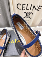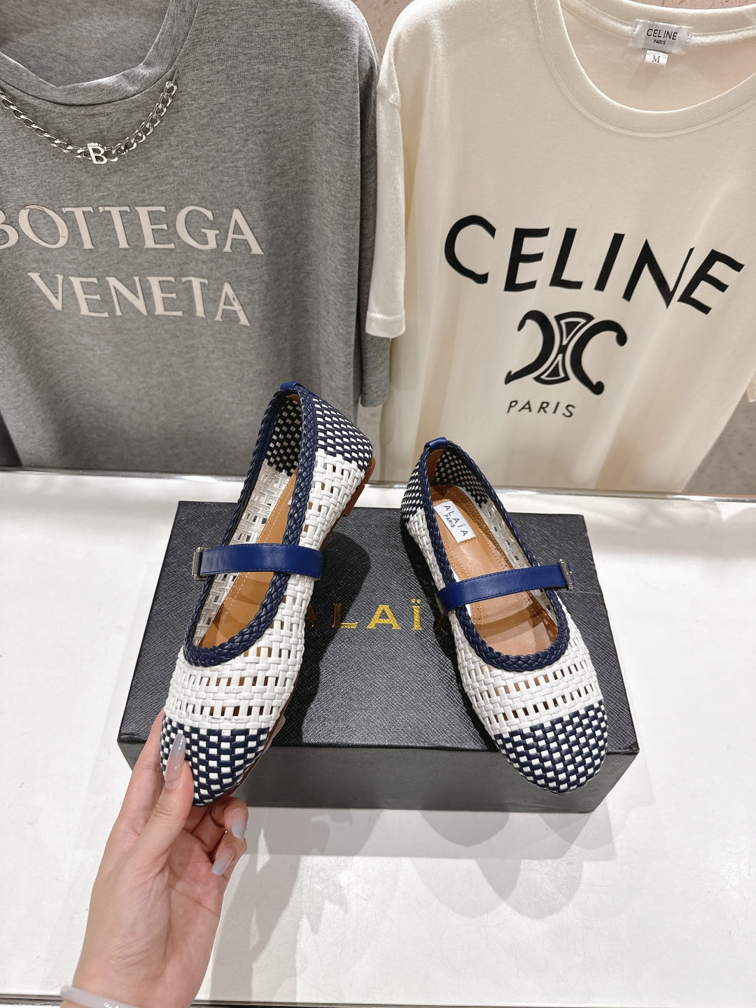 ALAIA MARY JANE FLATS white mix navy blue woven calfskin pattent