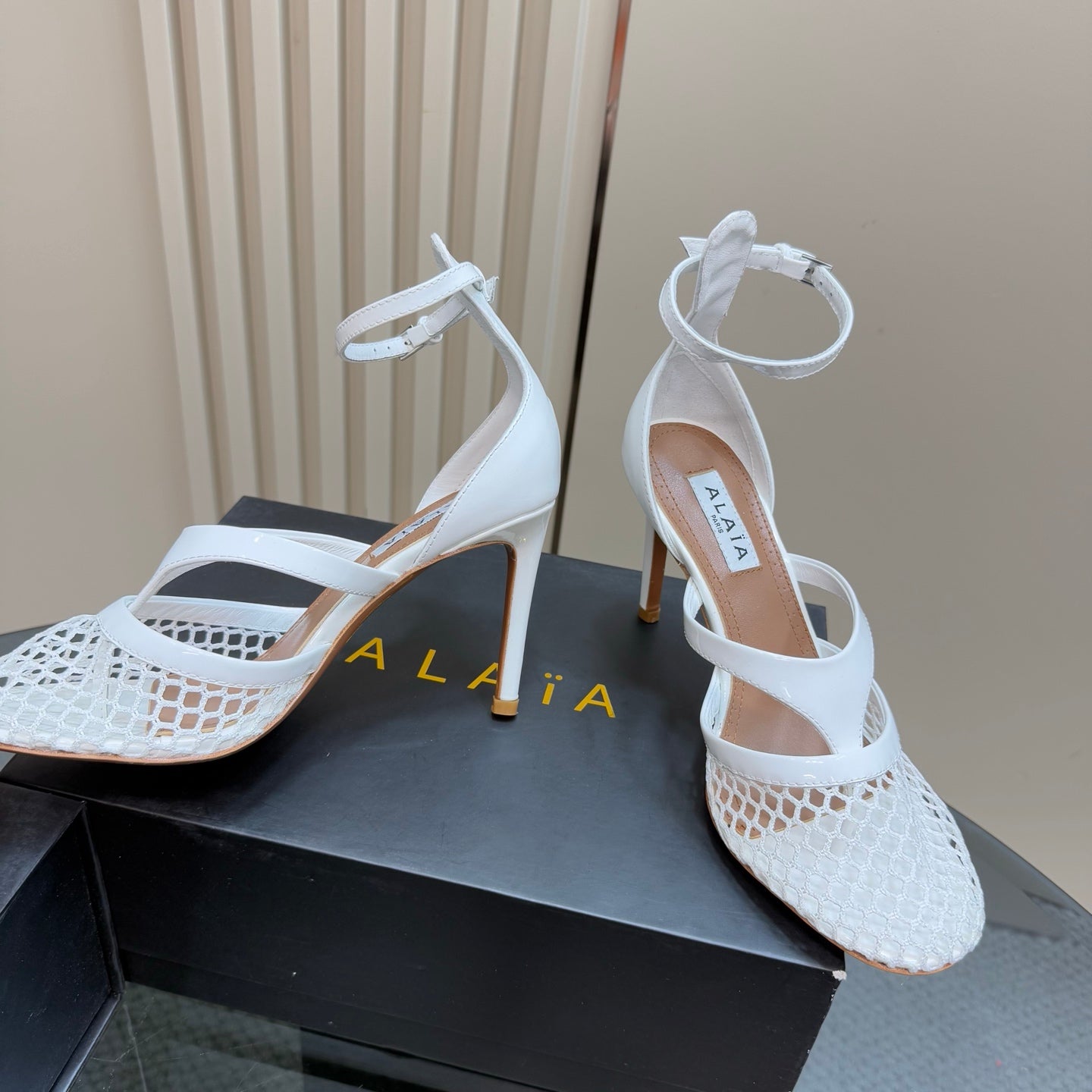alaia mule 85 fishnet cream heart lambskin