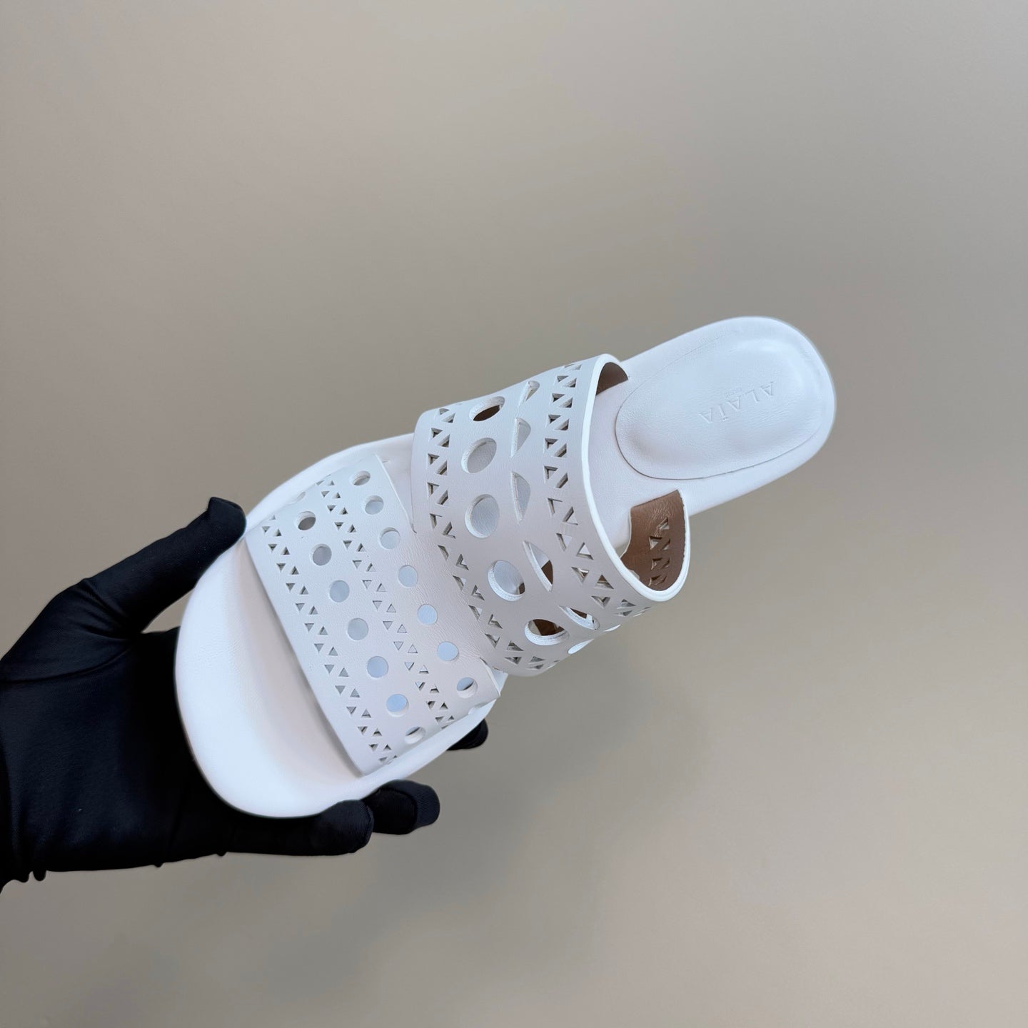 Alaia 2025 Vienne Cutout Kitten-Heel Slide Sandals White Leather 293650