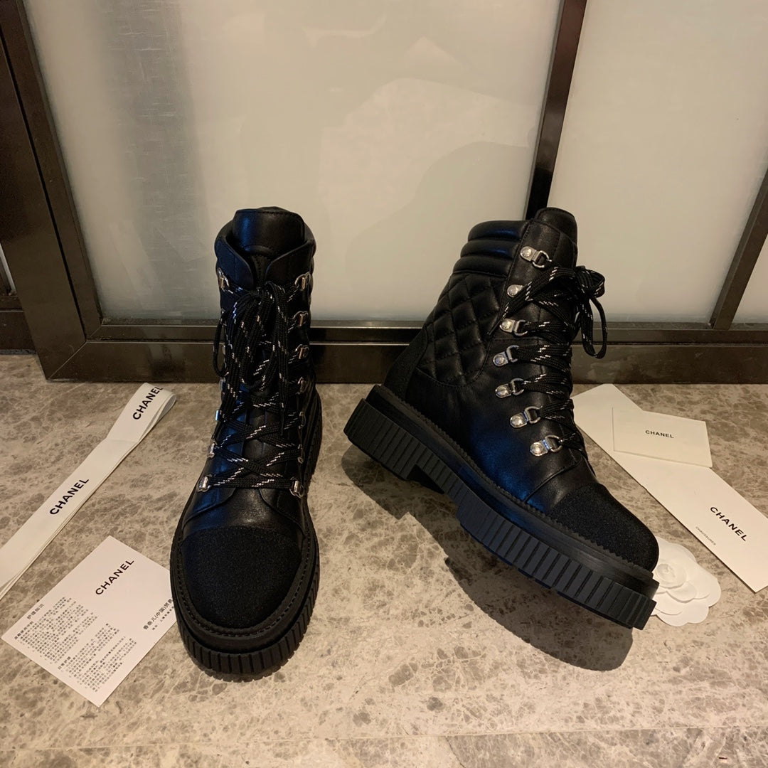 CC Combat Boots 50mm In Black Glossy Calfskin Quilted And Lycra Fabric 940073
