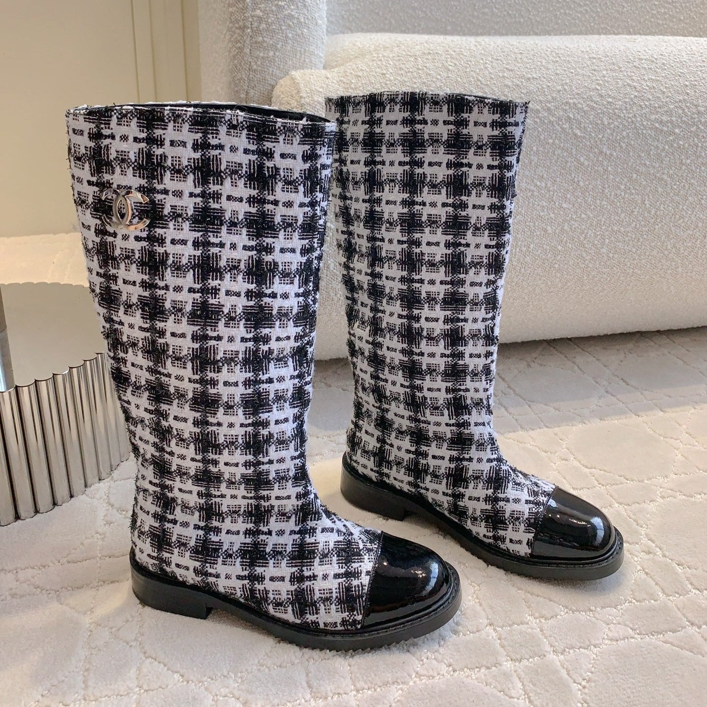 CC High Boots In Black Mix White Wool Tweed And Lambskin
