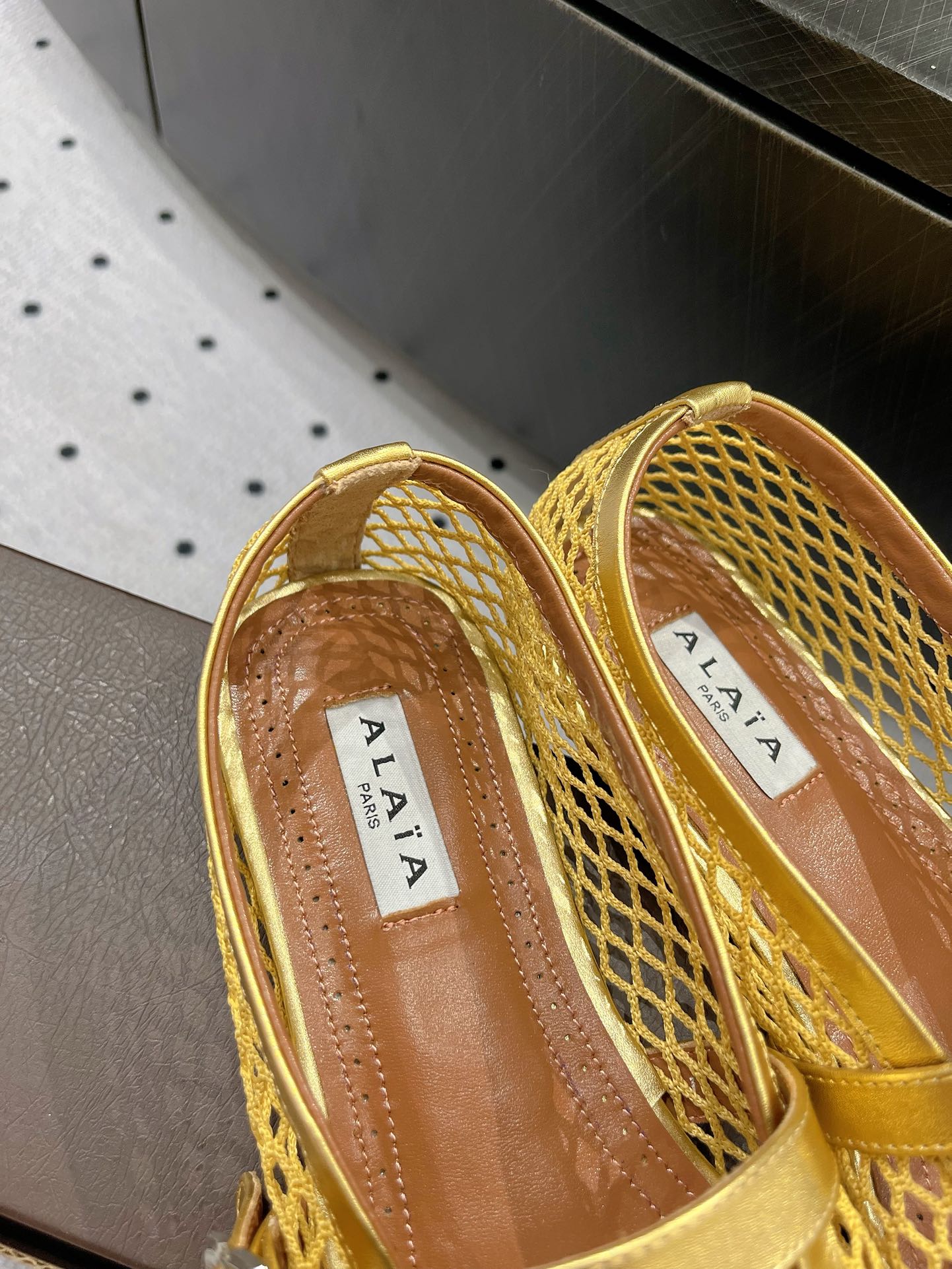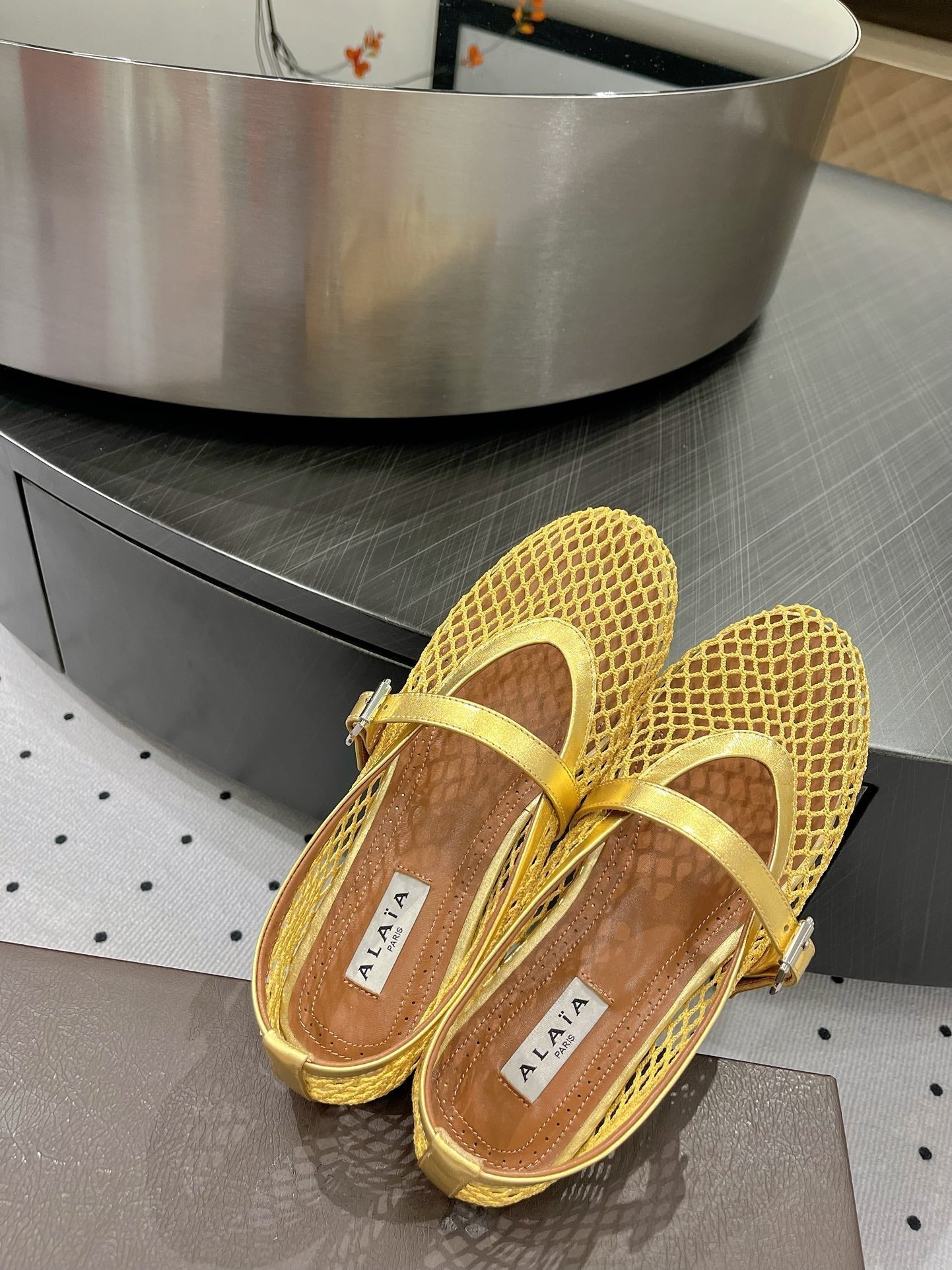 ALAIA BALLET FLATS IN BLACK MESH FISHNET WITH GOLD HARDWARE