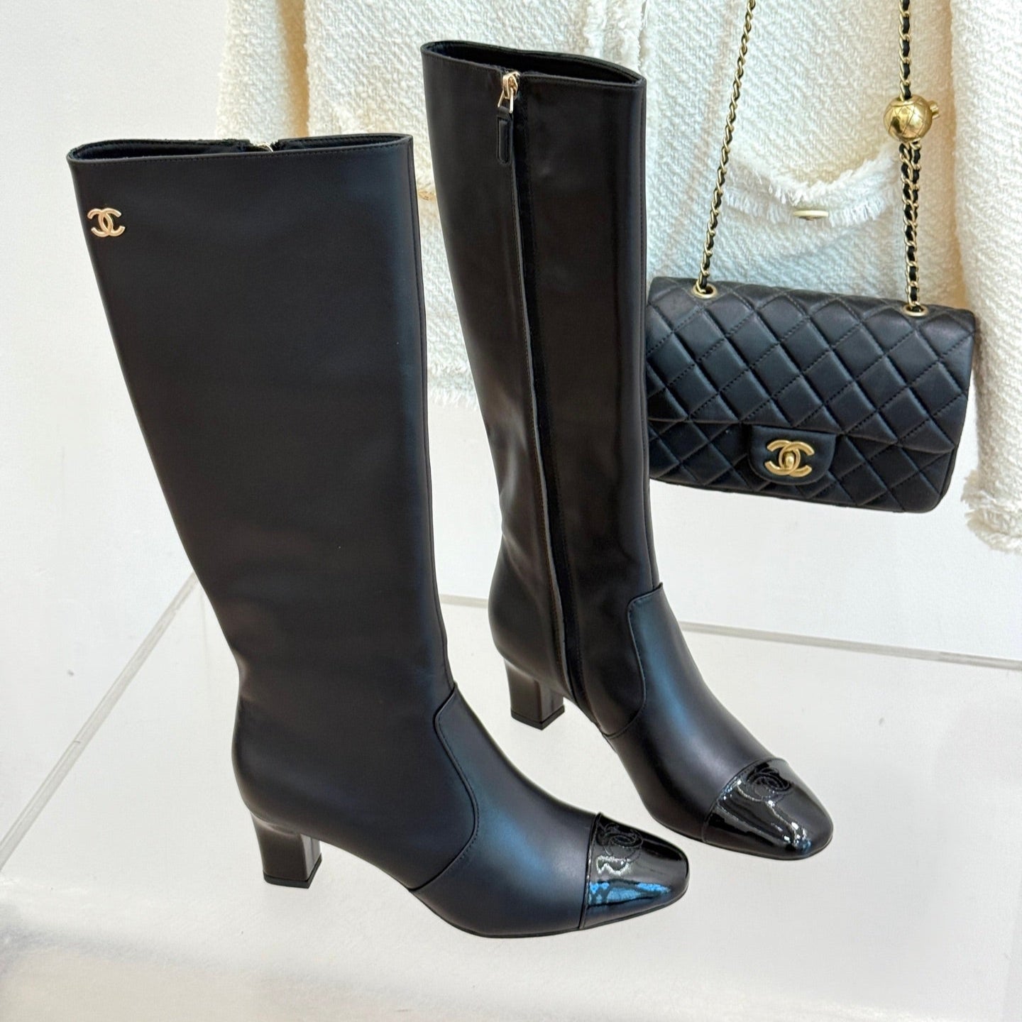 Chanel Double C Colorblock Heel Long Boot Black Sheepskin 465417