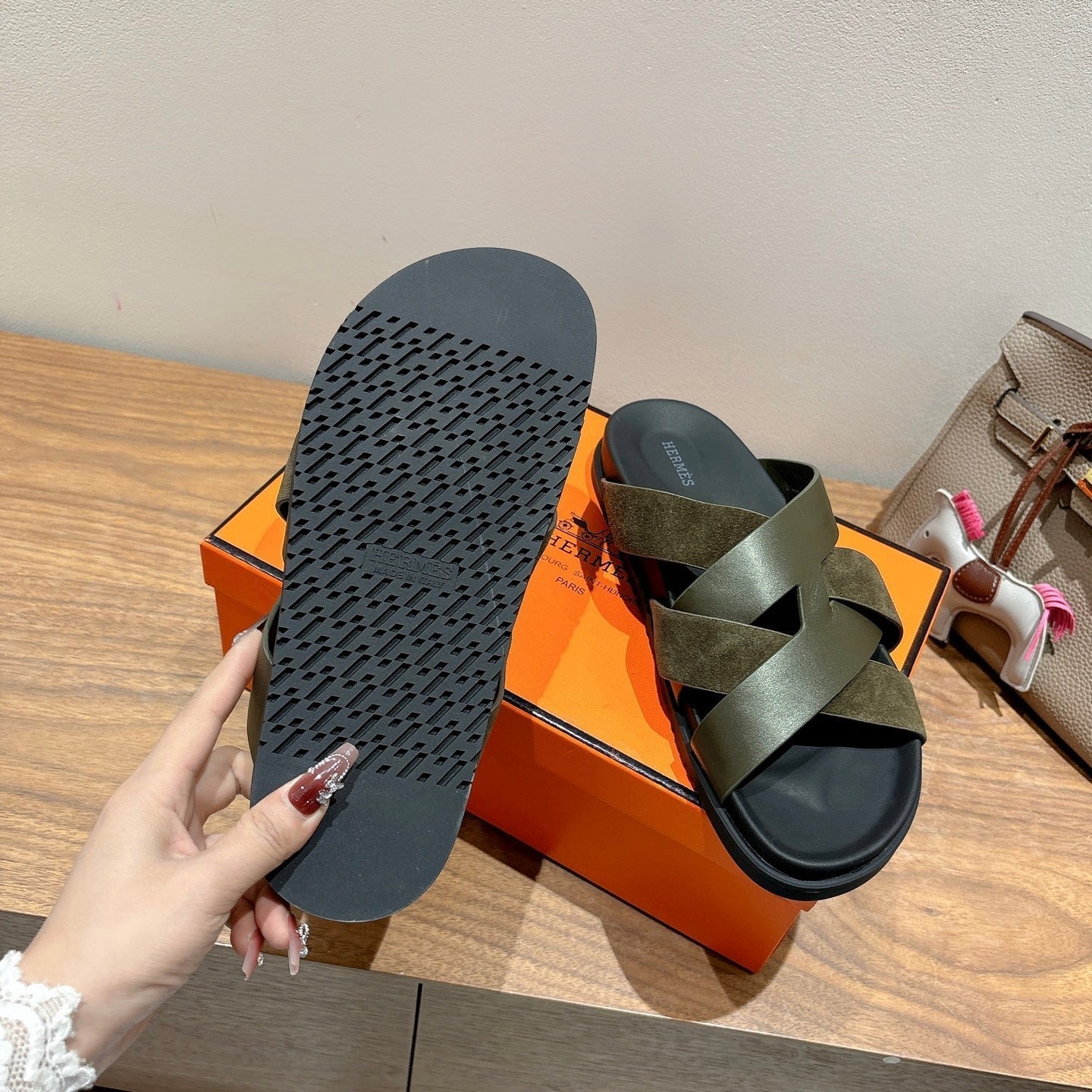 HM 25 Jackson Sandal Khaki Suede Black Calfskin