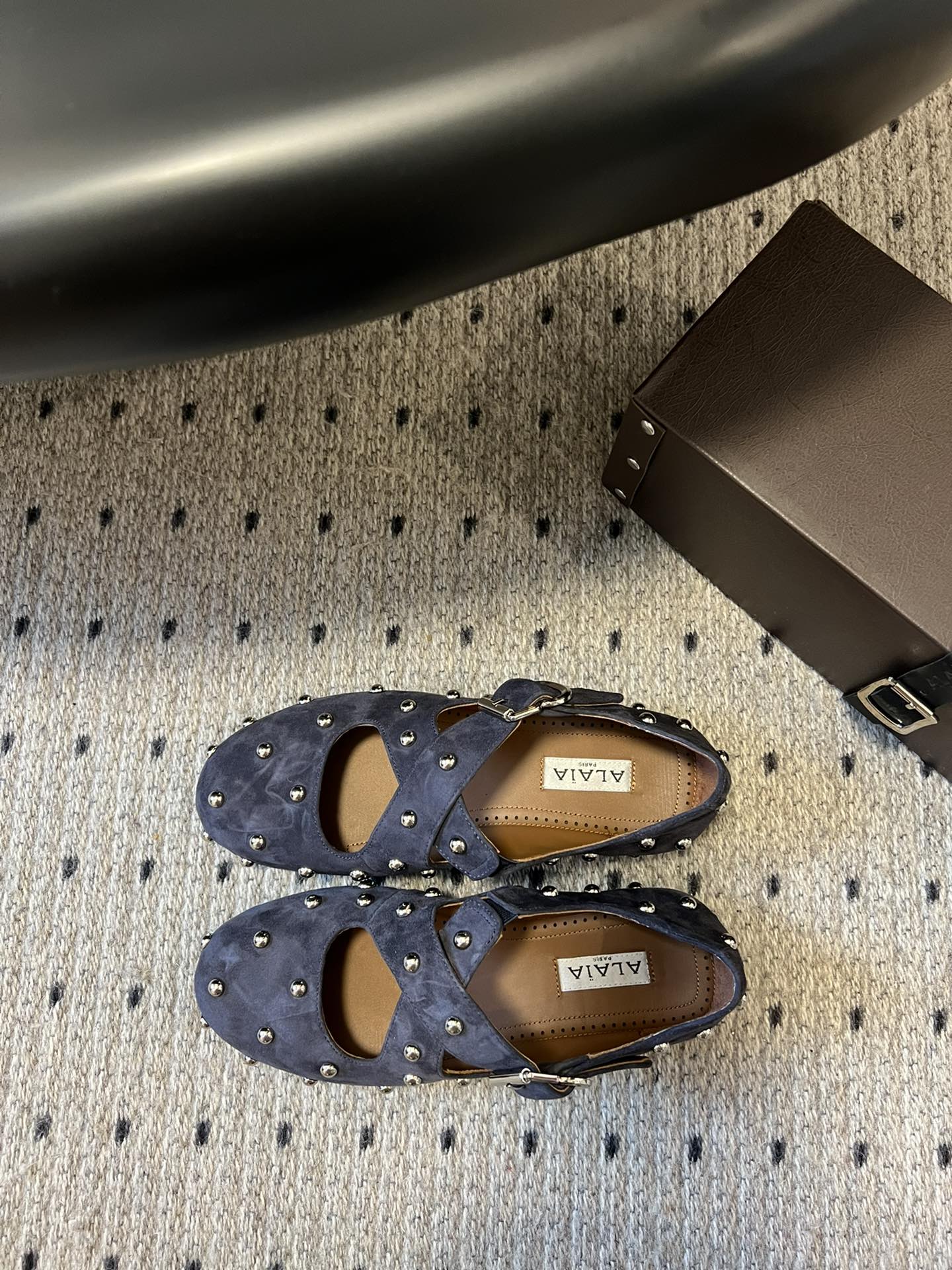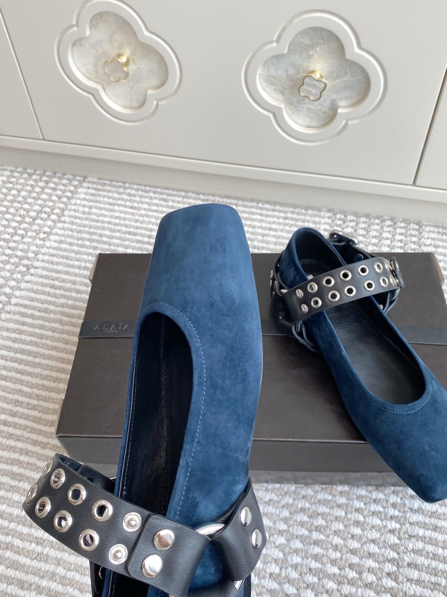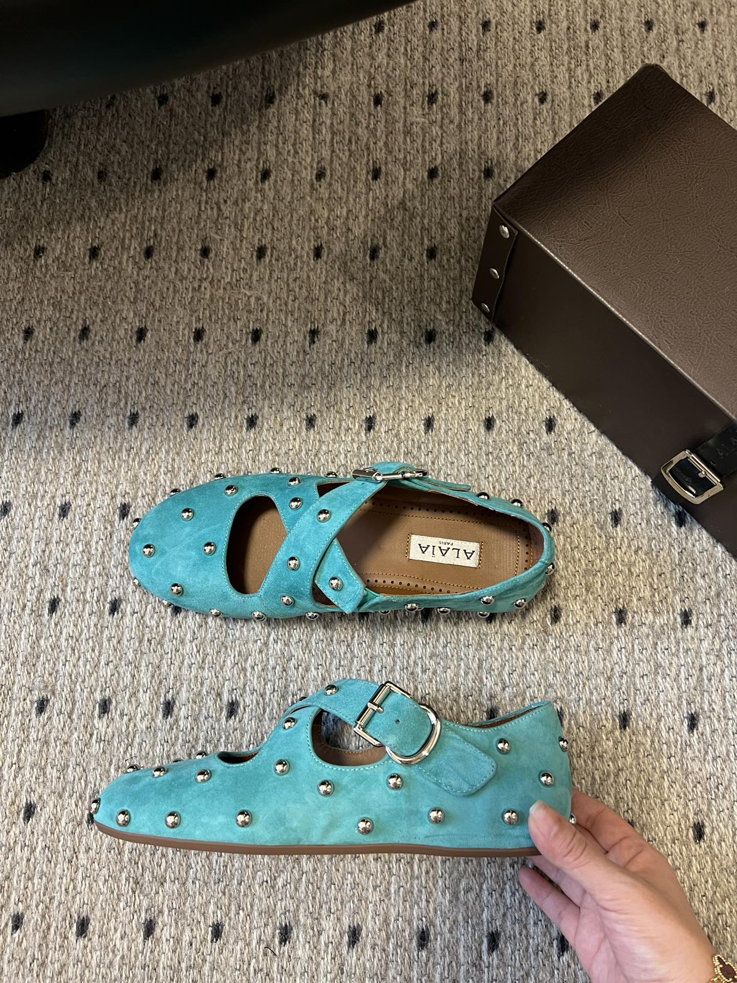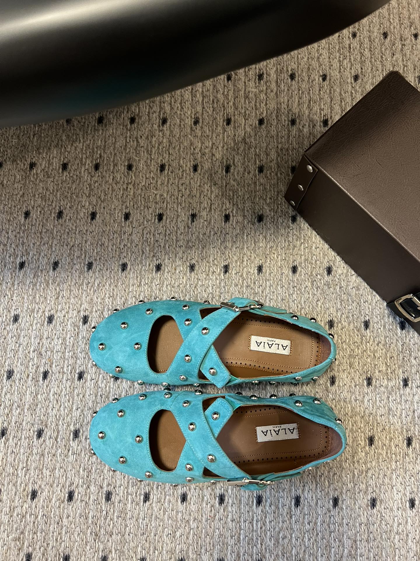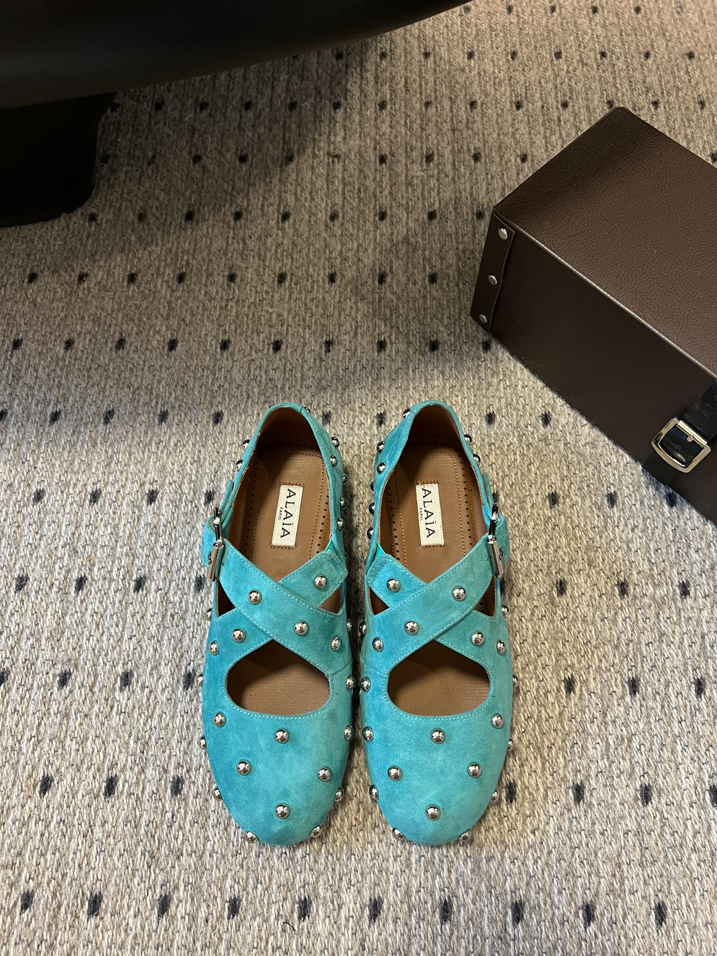 Alaia 25 Criss Cross With Stud Ballet Flats Azure Blue Suede Sheepskin 303691