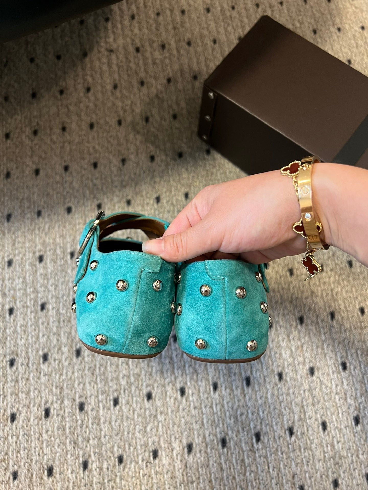 Alaia 25 Criss Cross With Stud Ballet Flats Lagoon Green Suede Sheepskin 303692