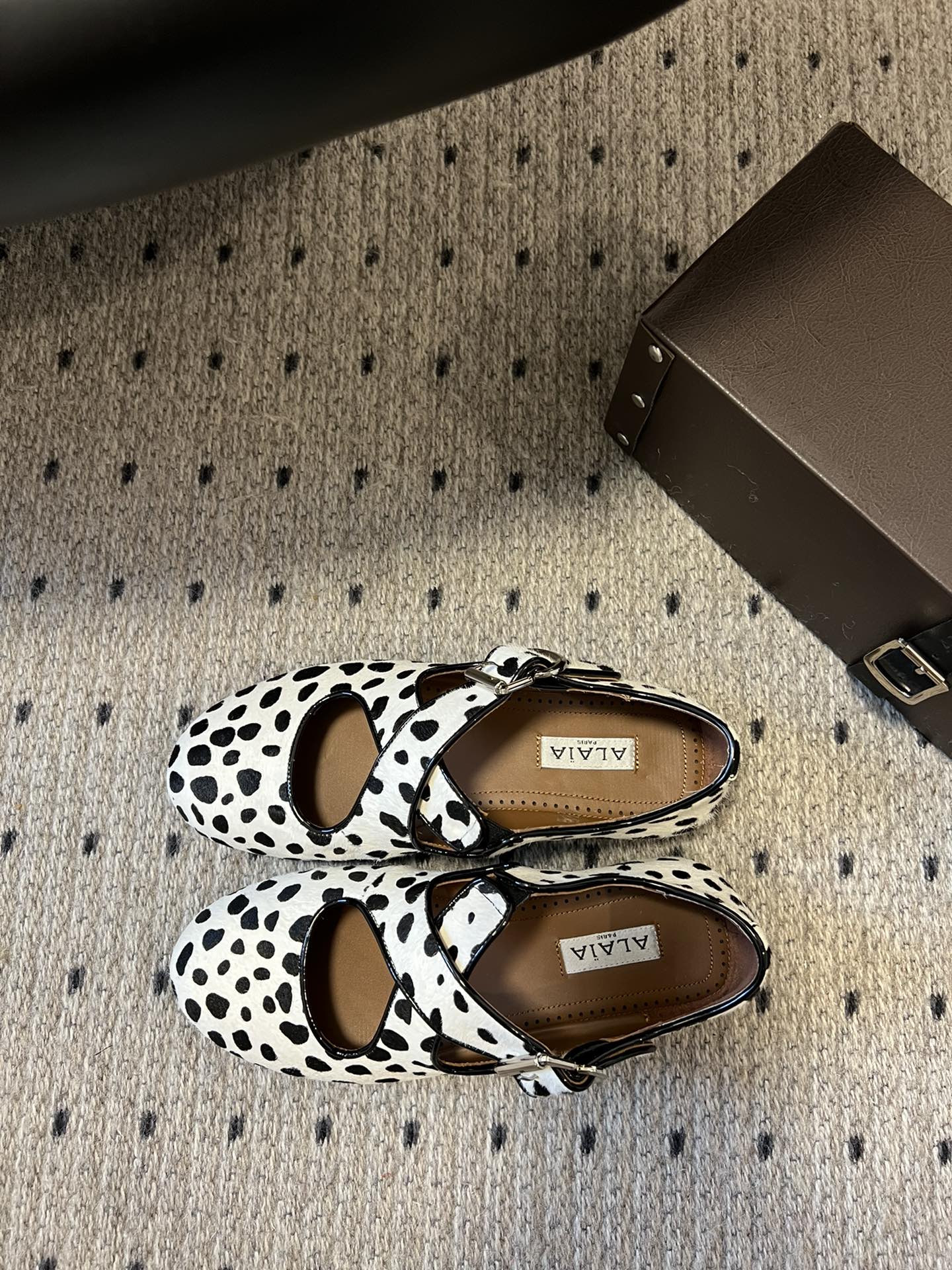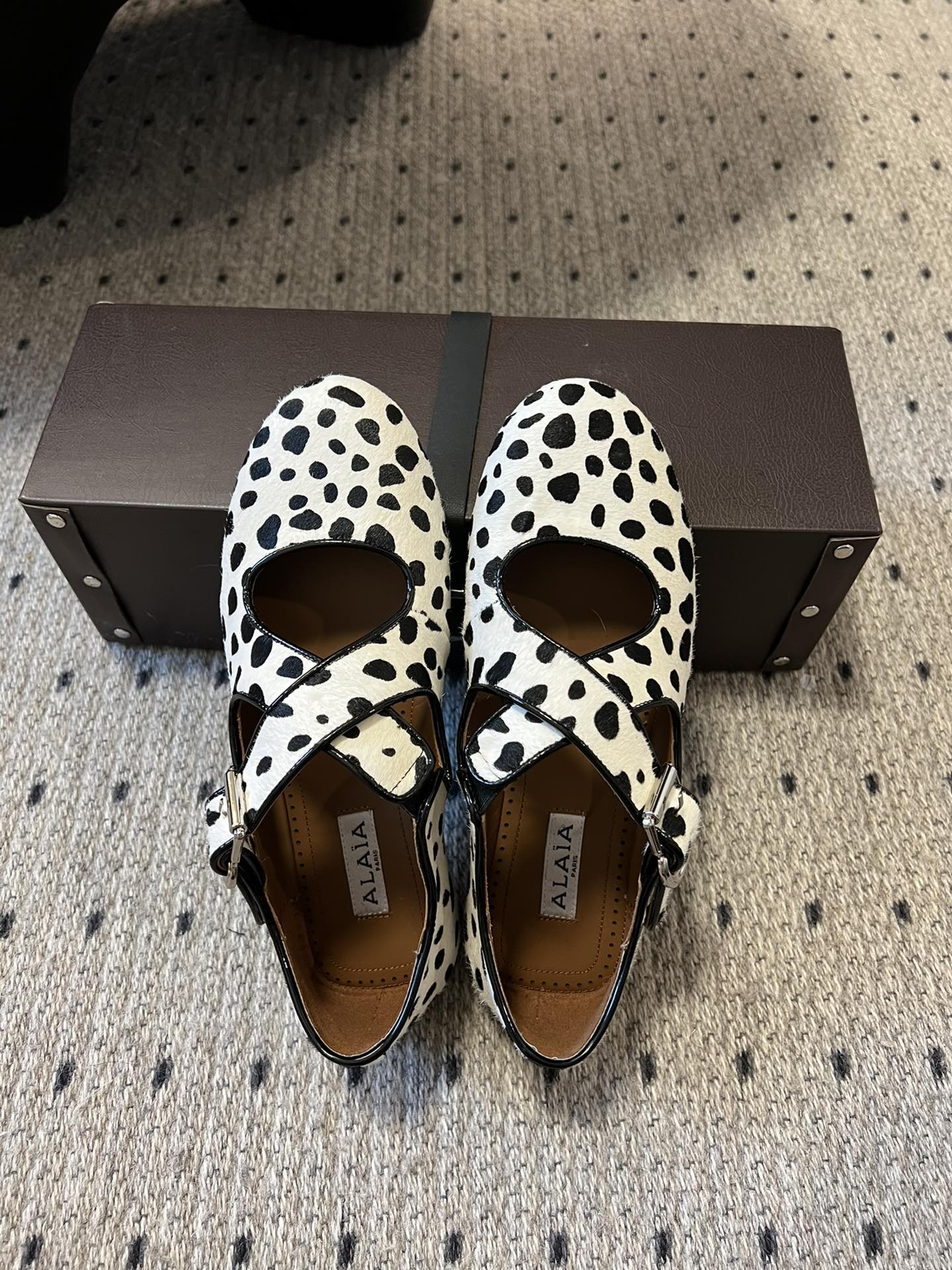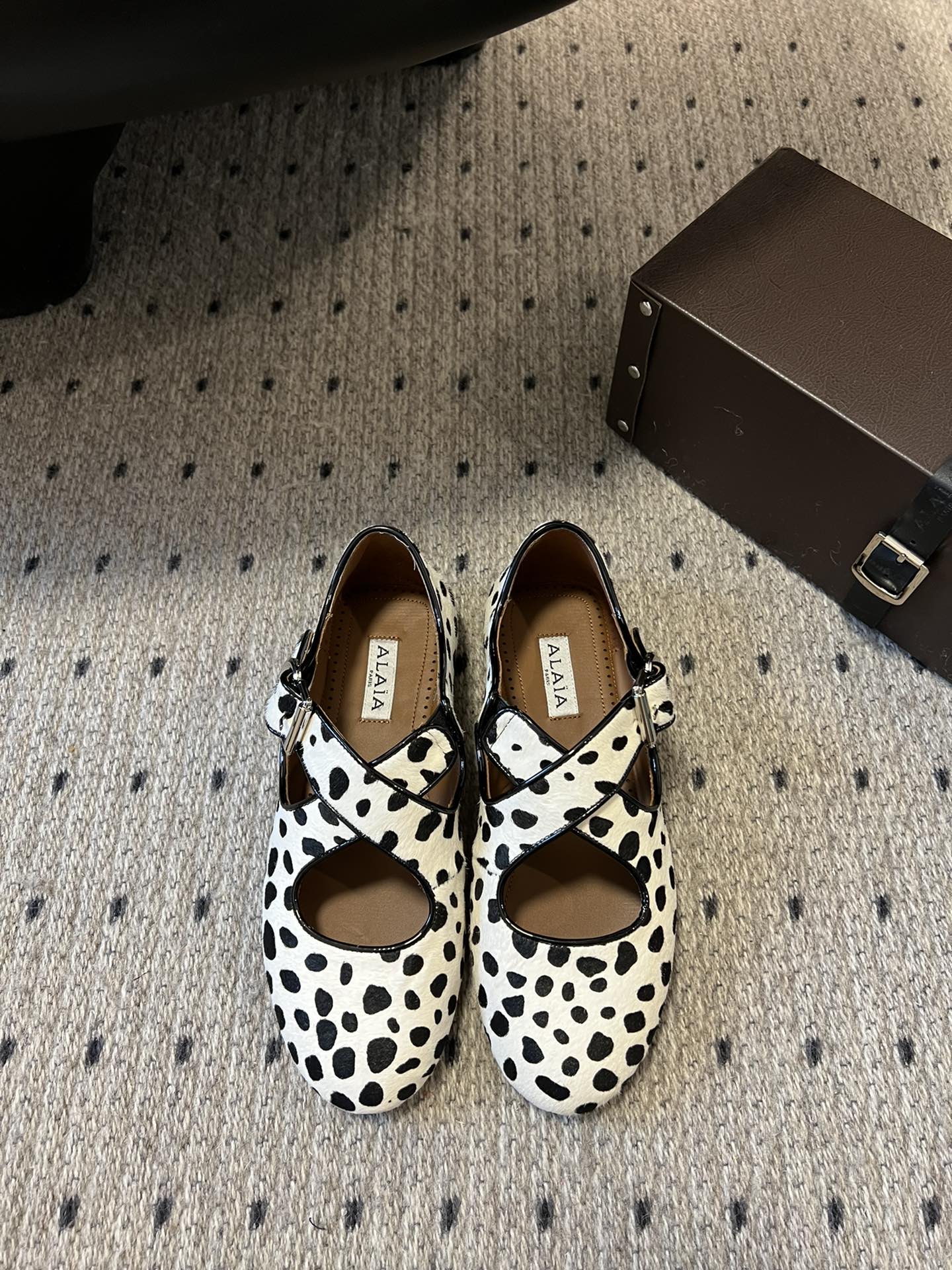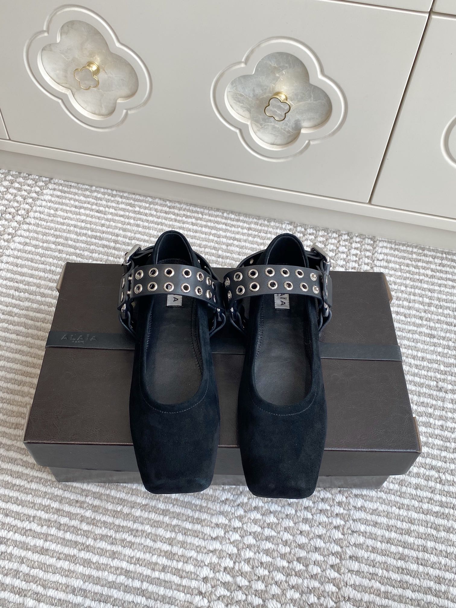 Alaia 25 Criss Cross With Stud Ballet Flats Black White Suede Sheepskin 303694