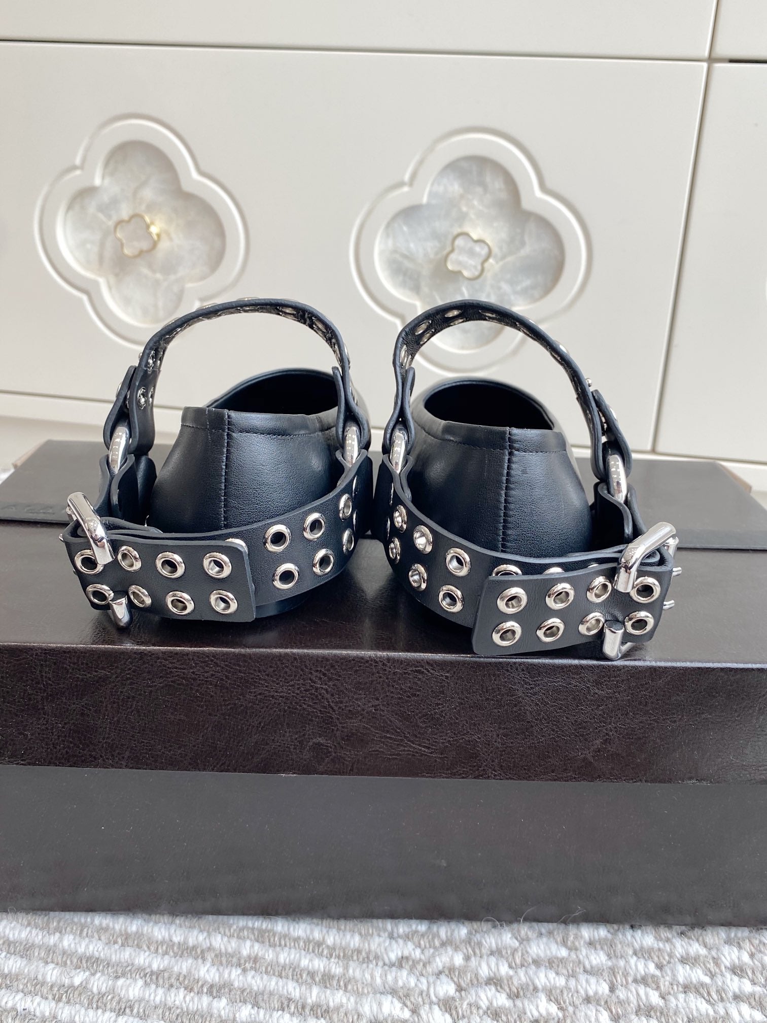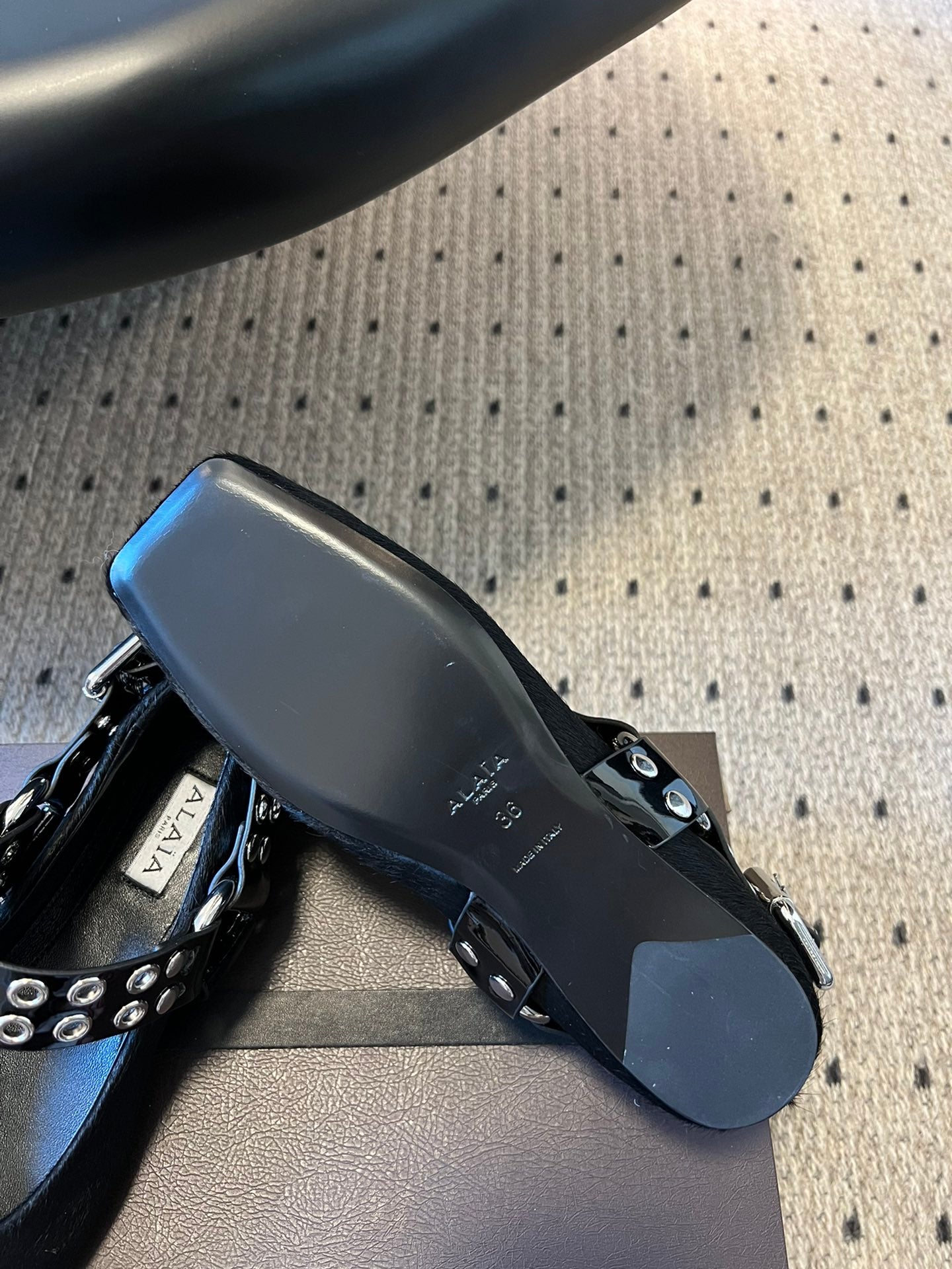Alaia 2025 Oeillets Embellished Leather Sandals Glossy Black Lambskin 299668