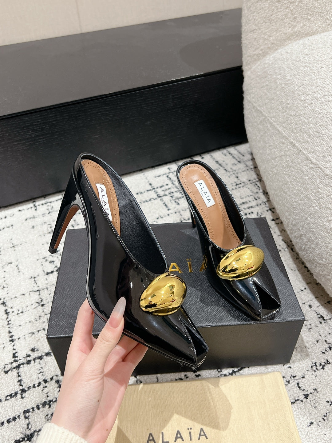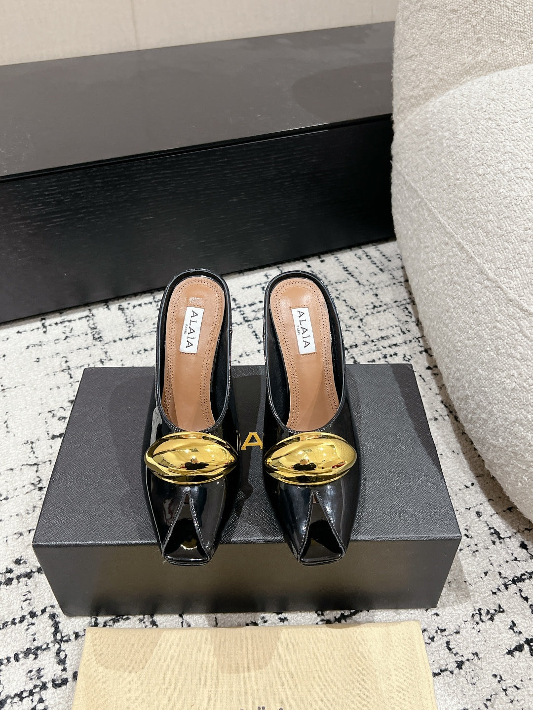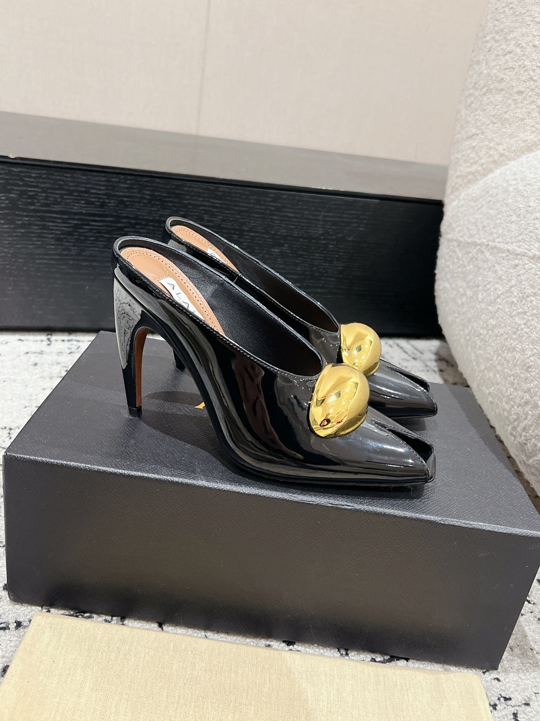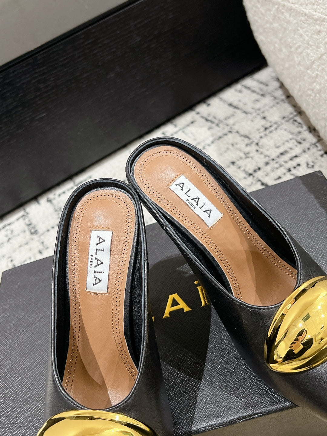 Alaia 25 Azzedine High Heels Mules With Gold Hardware Glossy Black Calfskin 293188