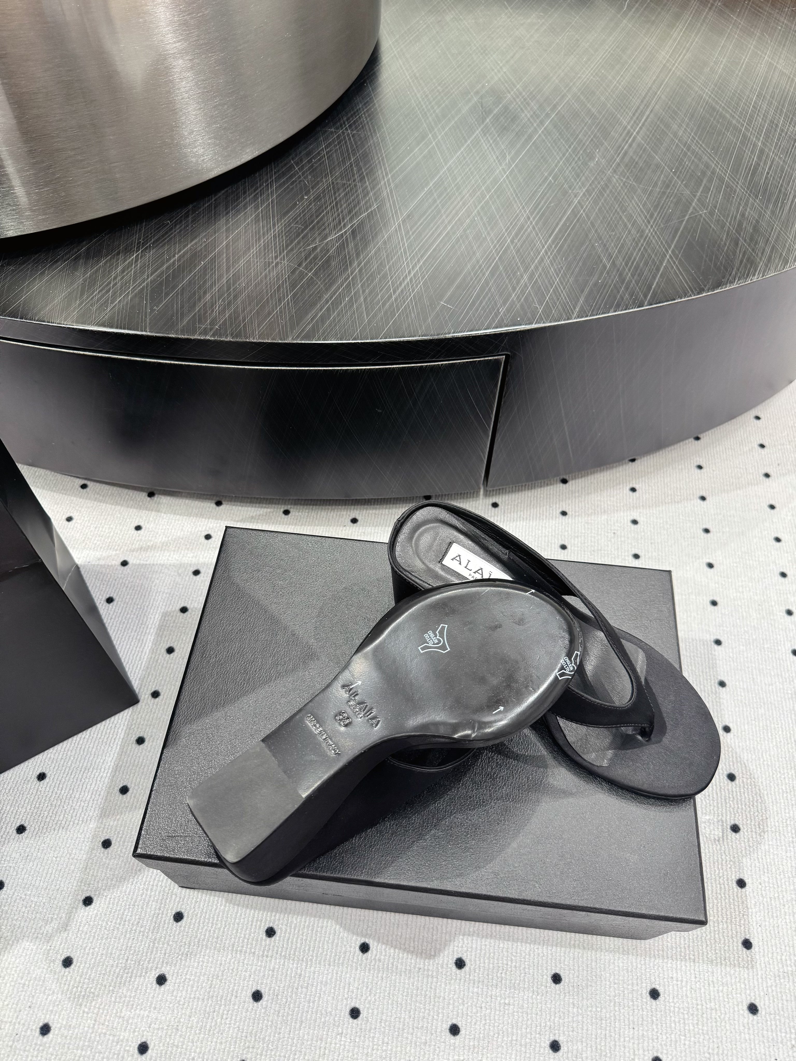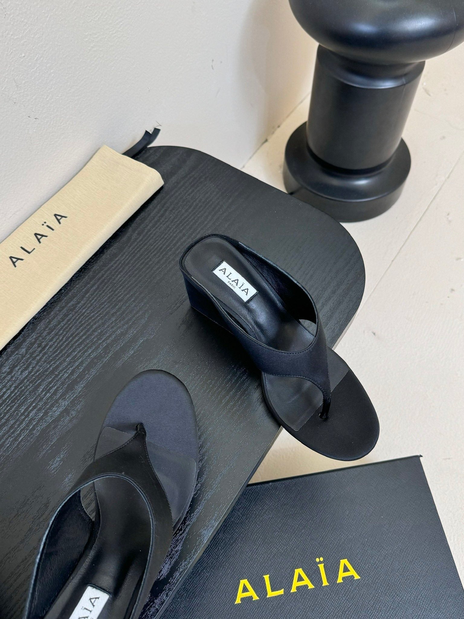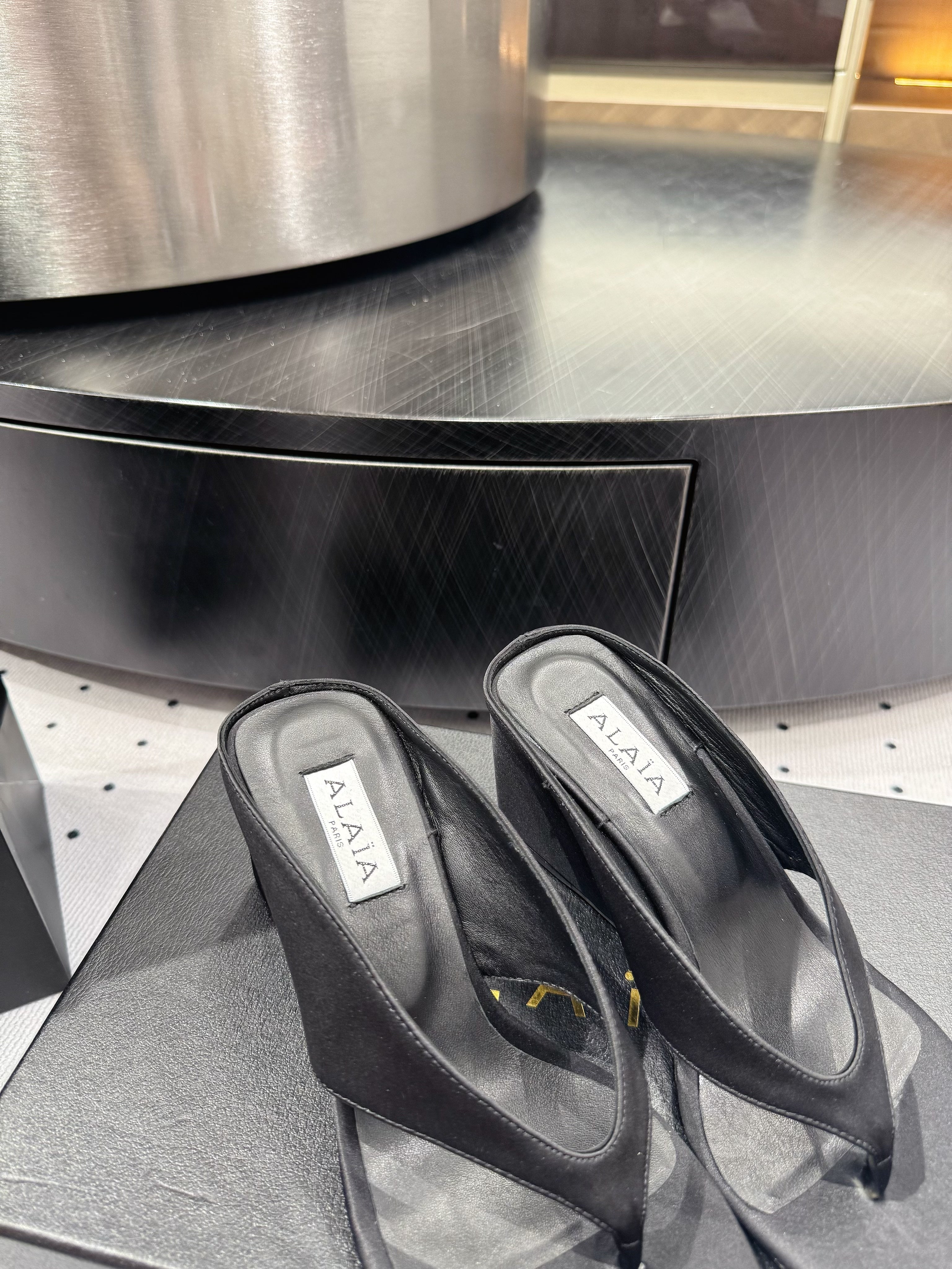 Alaia 25 Cube Thong Mules Black Satin Sheepskin 297039