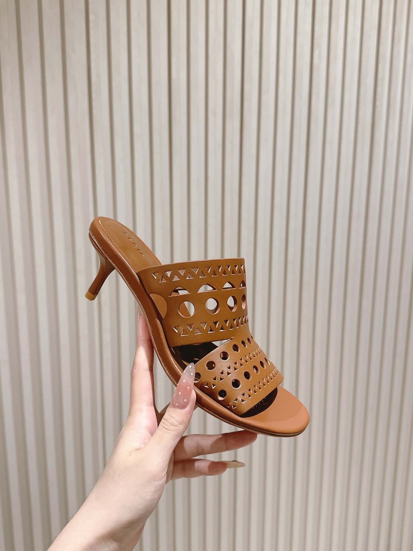 Alaia 2025 Vienne Cutout Kitten-Heel Slide Sandals Brown Leather 293649