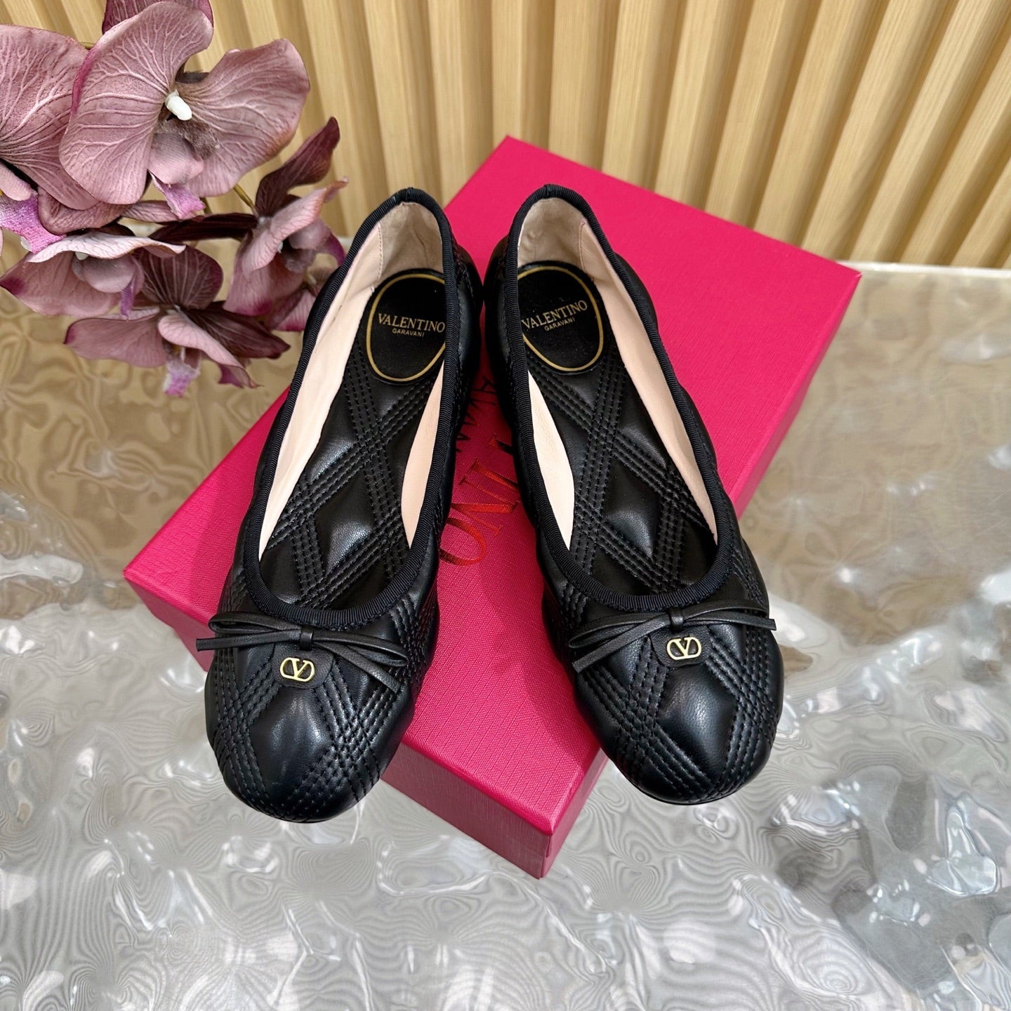 VT 2025 Quilted Leather Bow Ballerina Flats Black Sheepskin 286493
