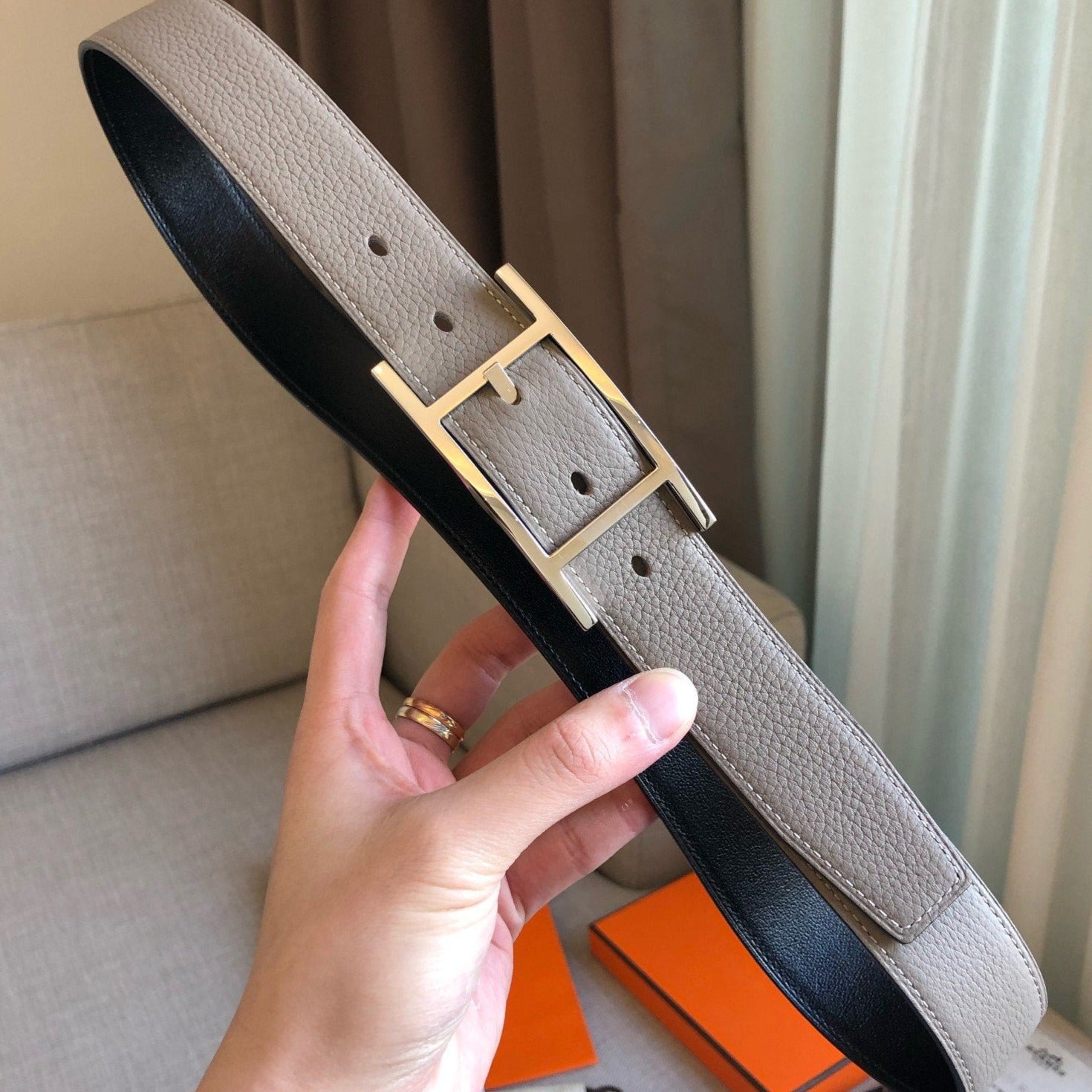 H BELT SILVER BUCKLE GREY BLACK LEATHER REVERSIBLE 3.2CM