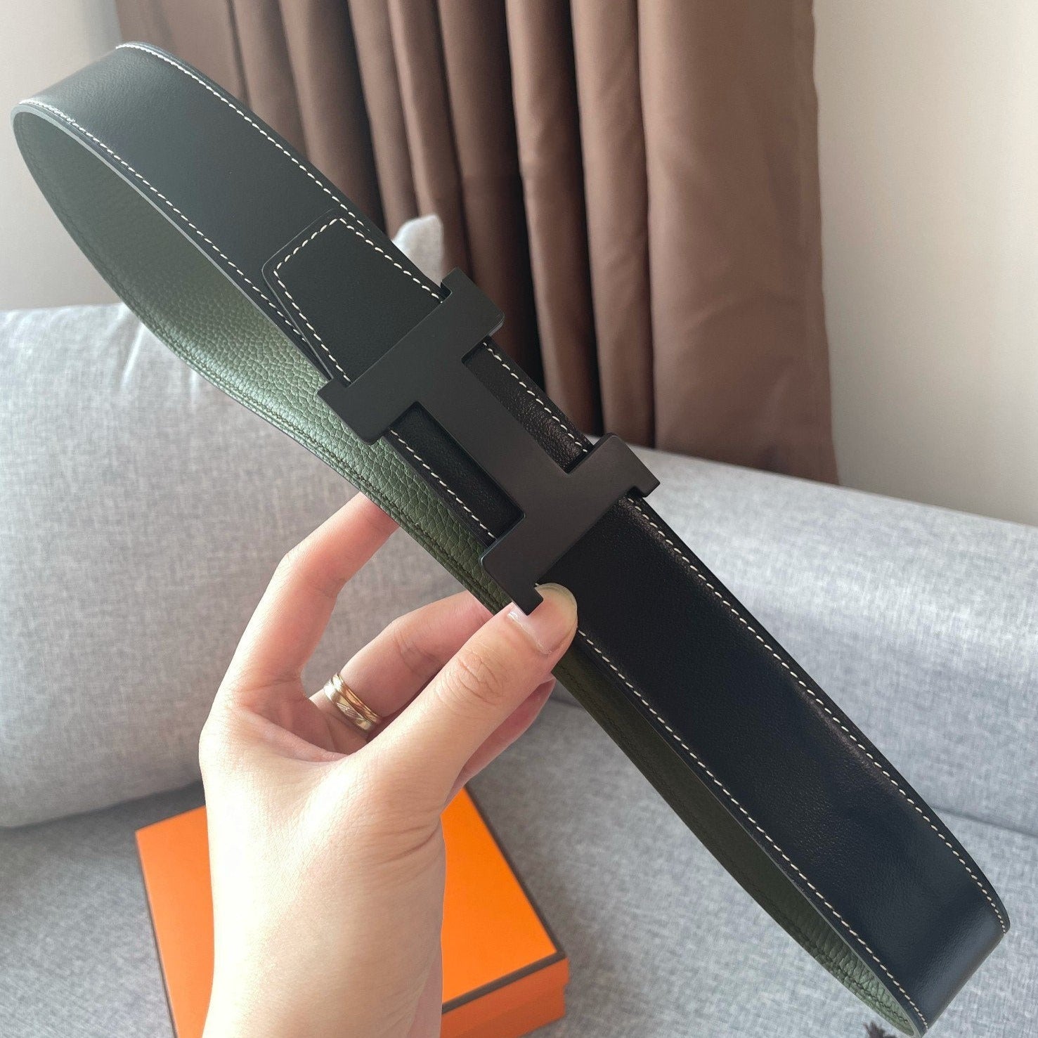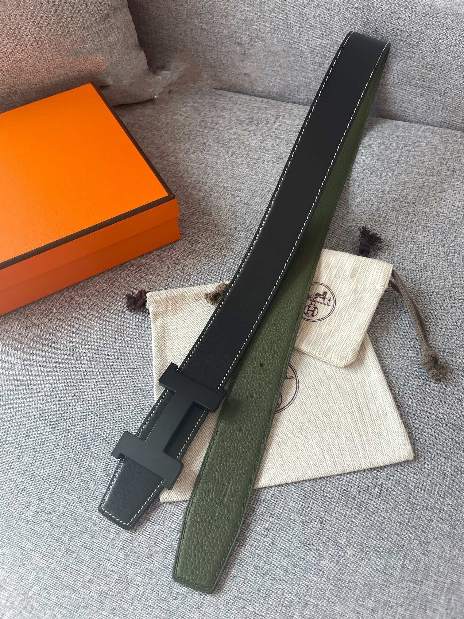 H CONSTANCE REVERSIBLE BELT 38MM BLACK BUCKLE BLACK GREEN LEATHER