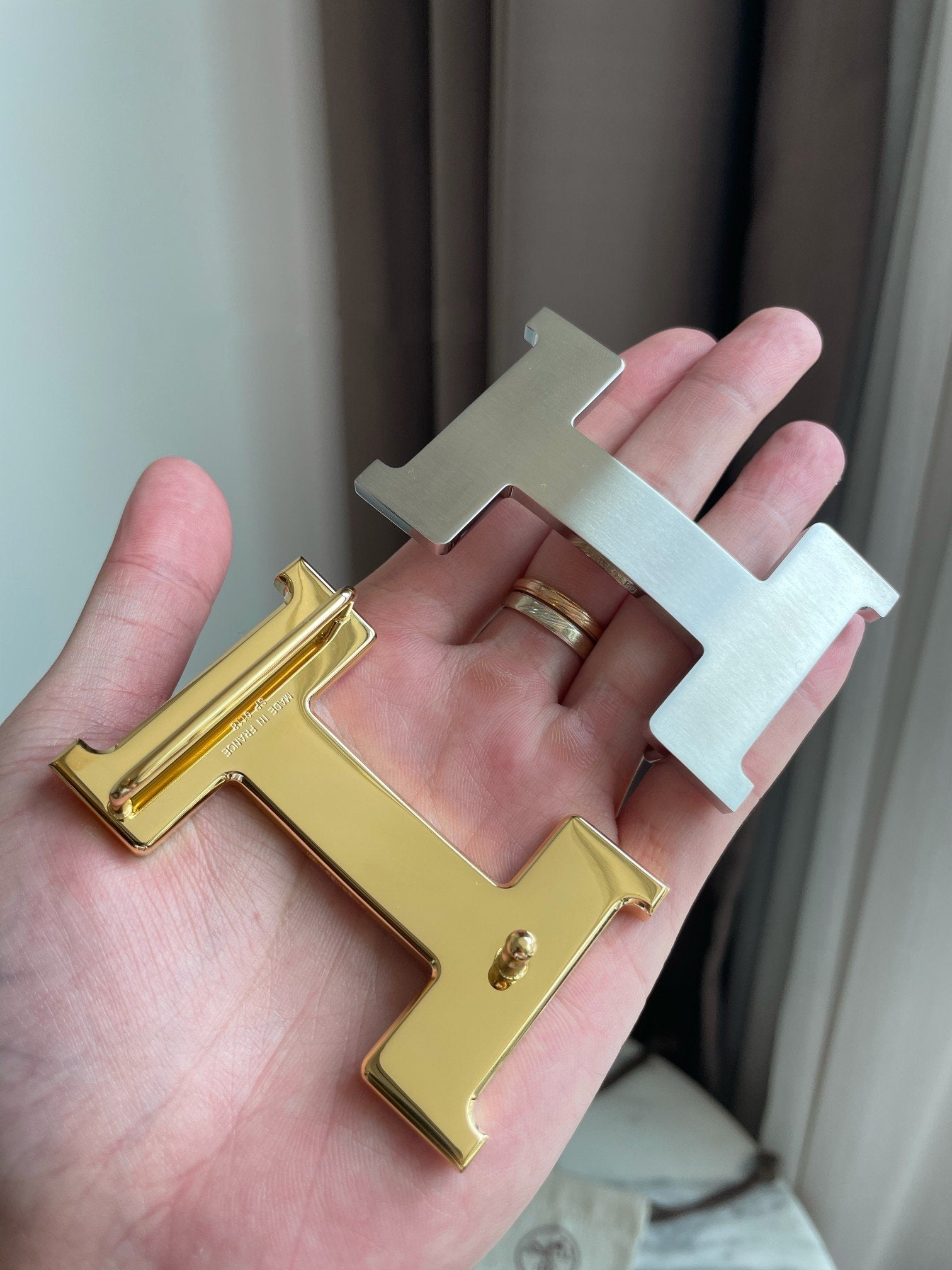 • H Buckle in permabrass plated metal.