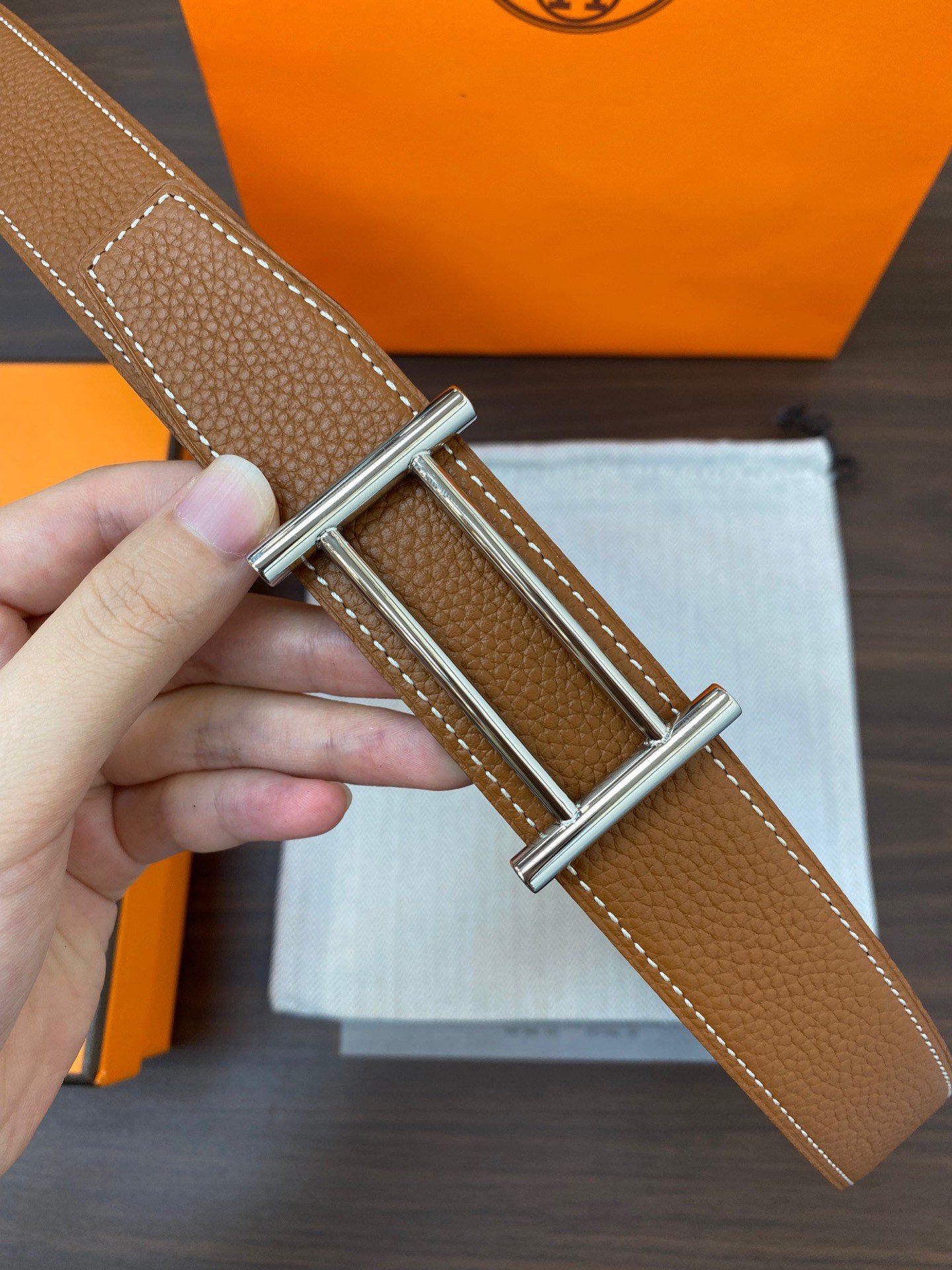 • H Buckle in permabrass plated metal.