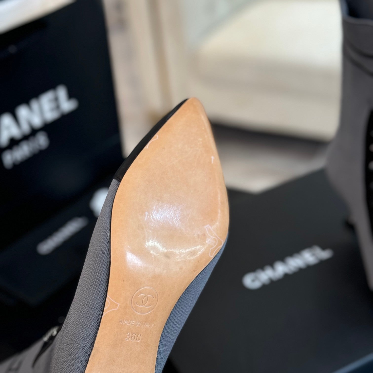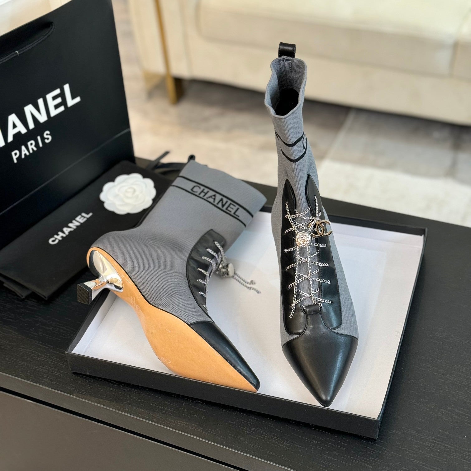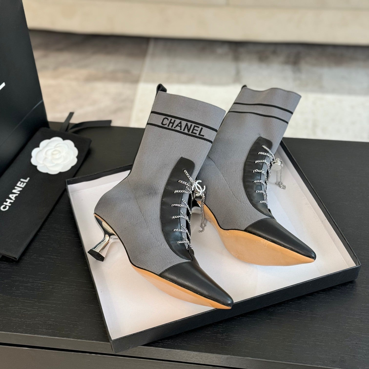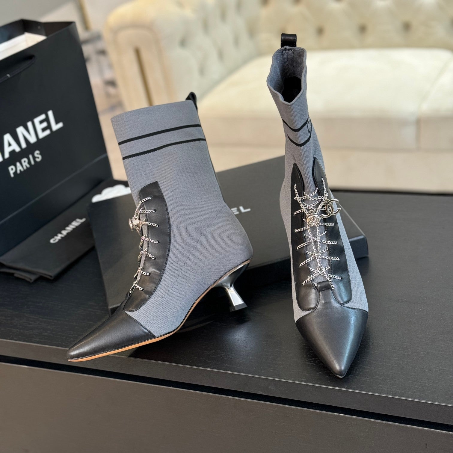 CC Ankle Boots Grey Black Chain Wool And Lambskin