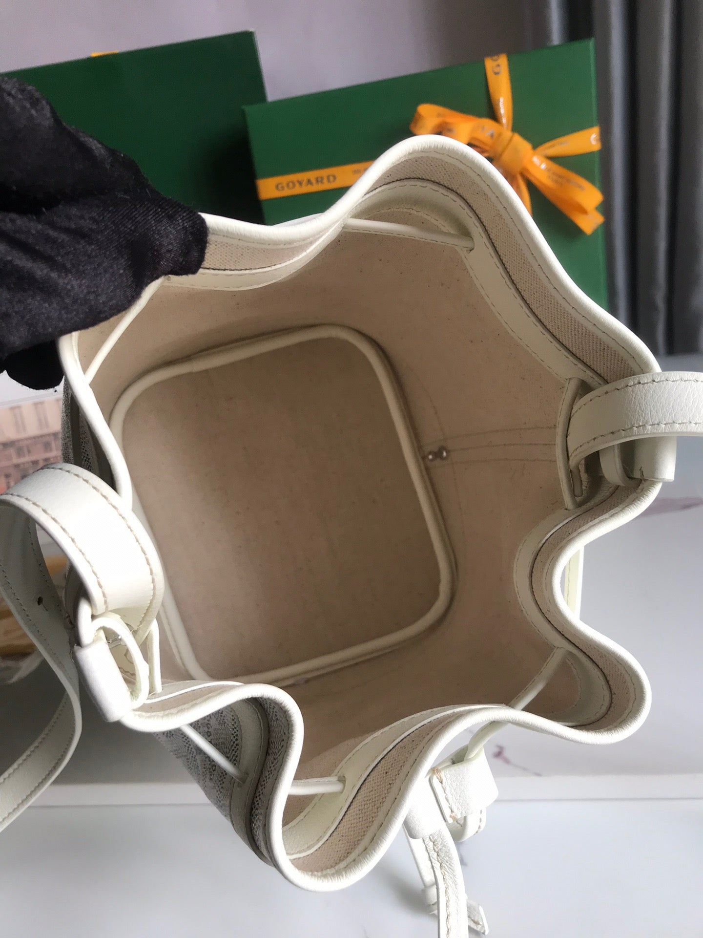 PETIT FLOT BUCKET BAG 22 IN WHITE GOYARDINE CANVAS AND LAMBSKIN TRIM