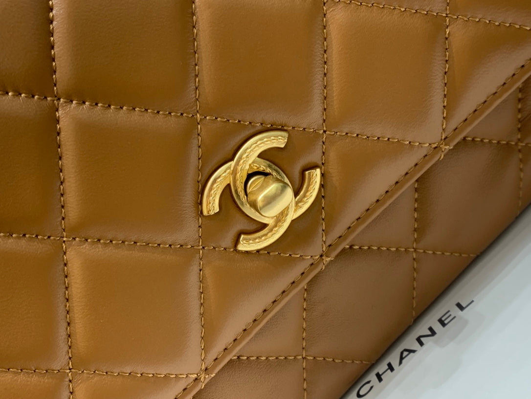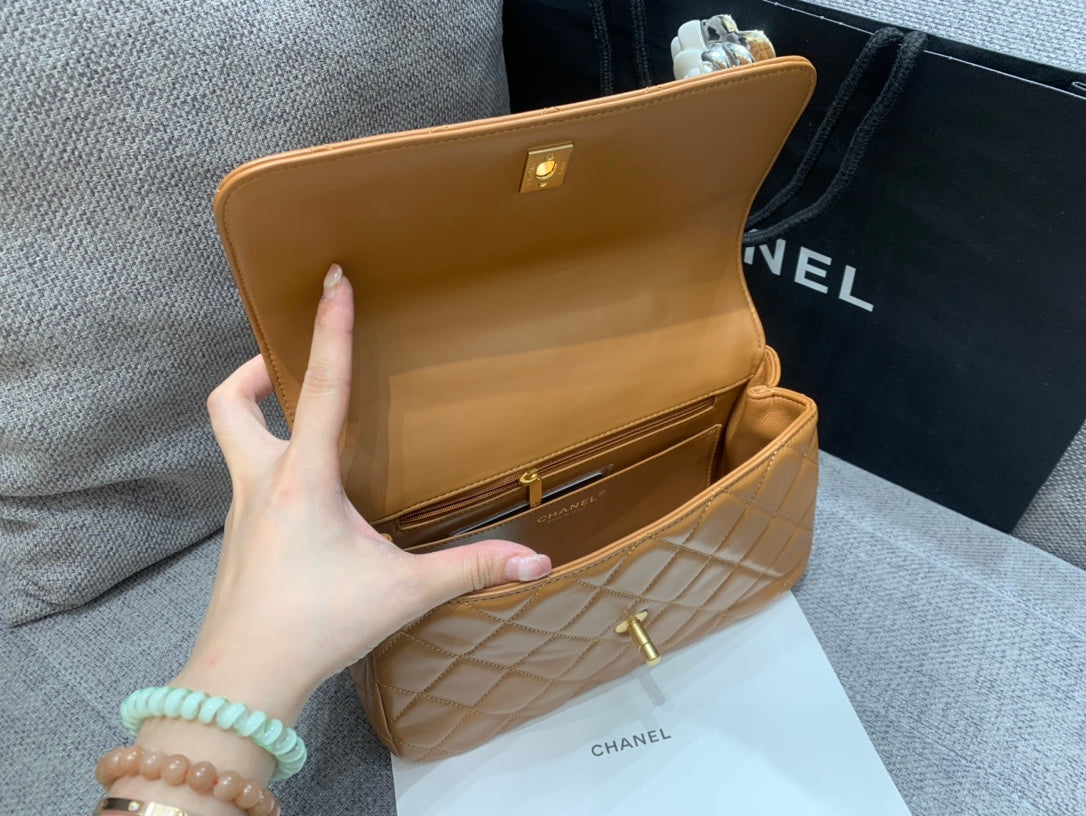 SMALL FLAP BAG 24CM TOP HANDLE BROWN LAMBSKIN GOLD HARDWARE