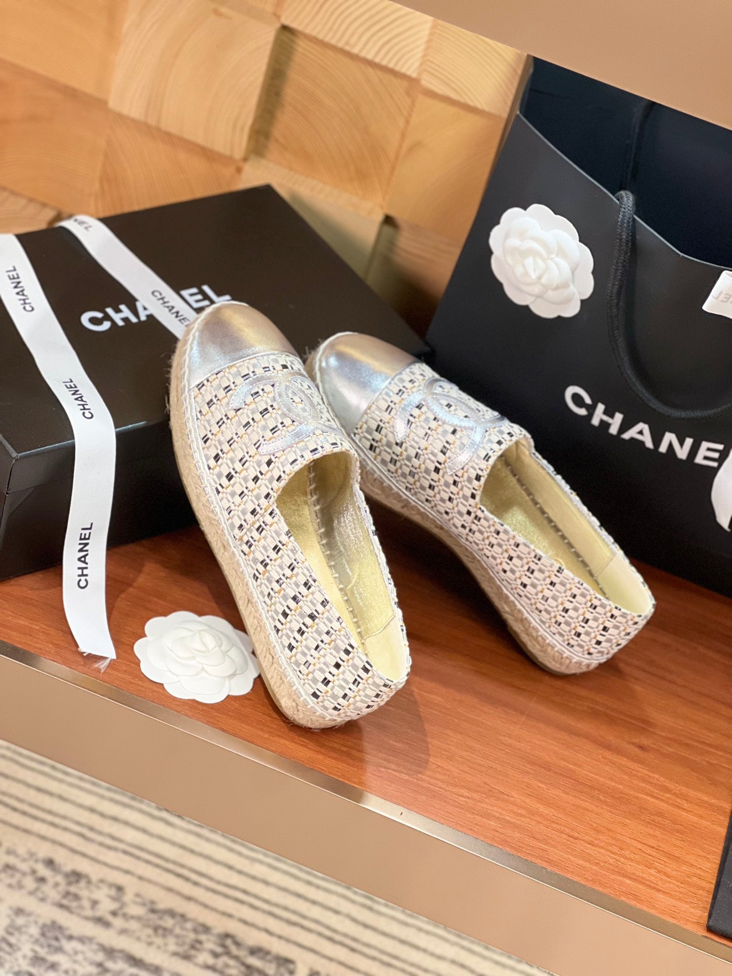 cc espadrilles beige black woolen cloth silver metalic lambskin