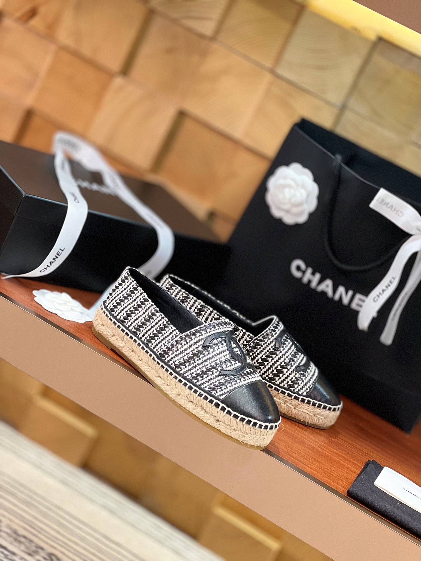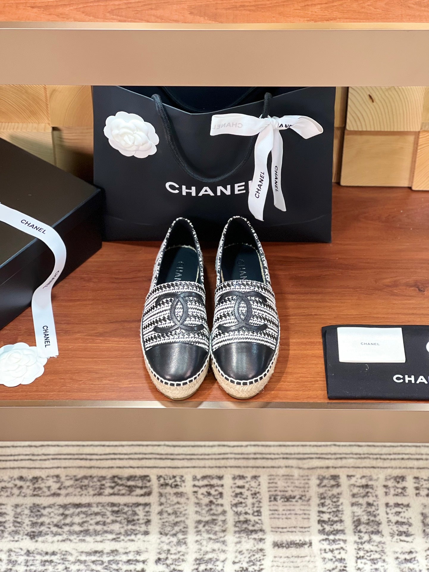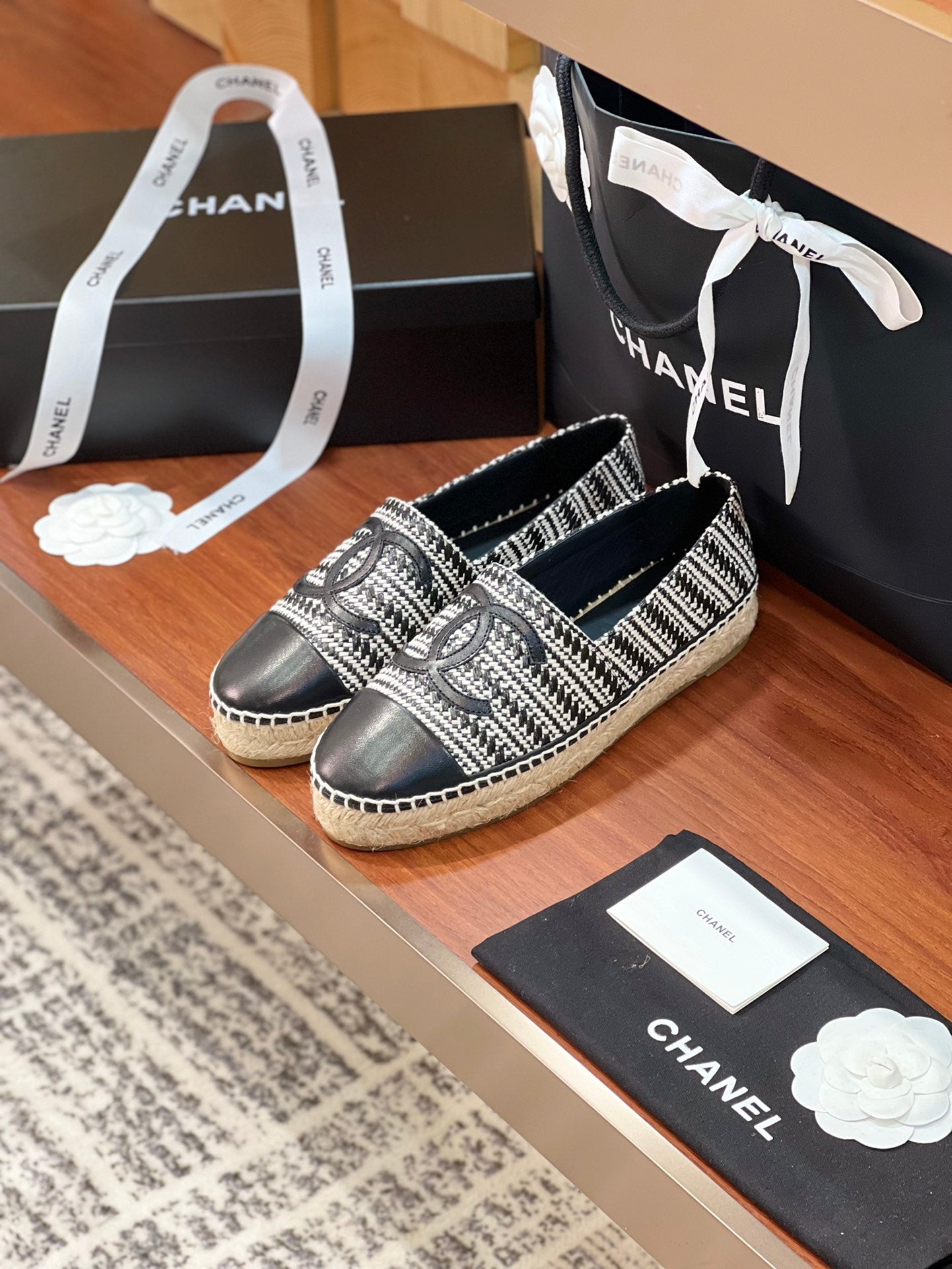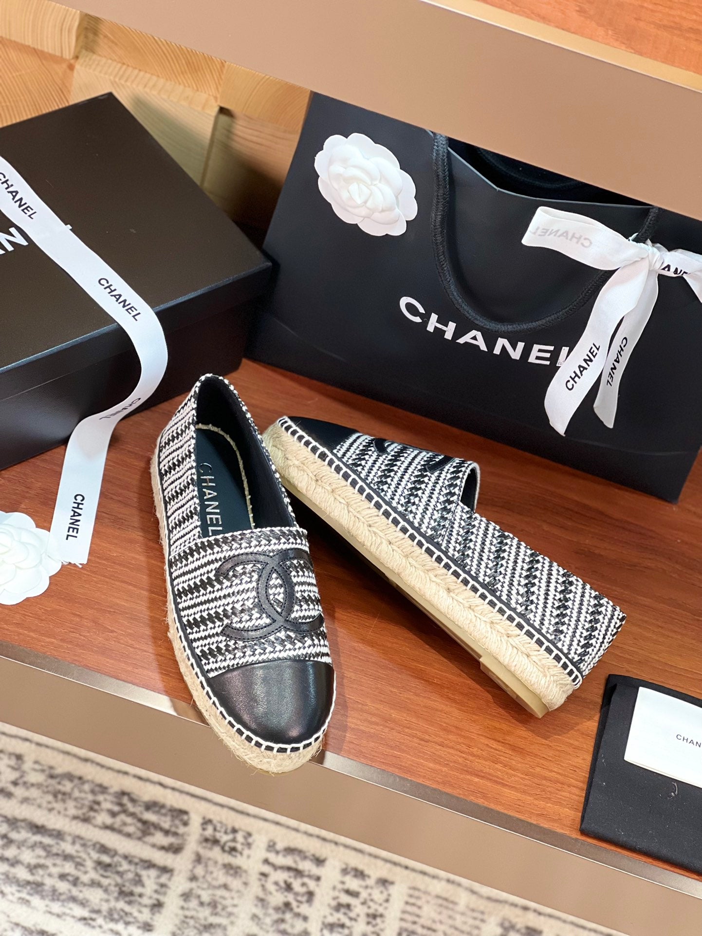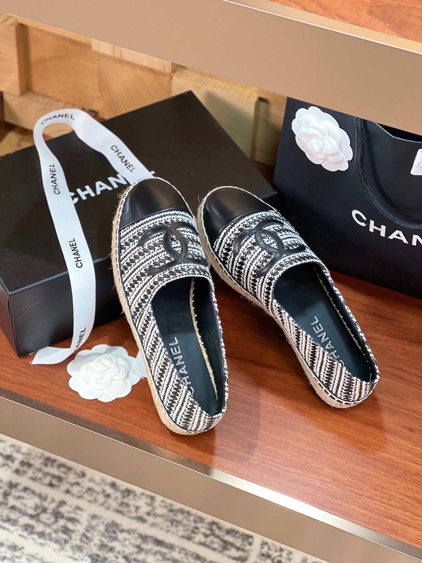 cc espadrilles black white woolen cloth black lambskin