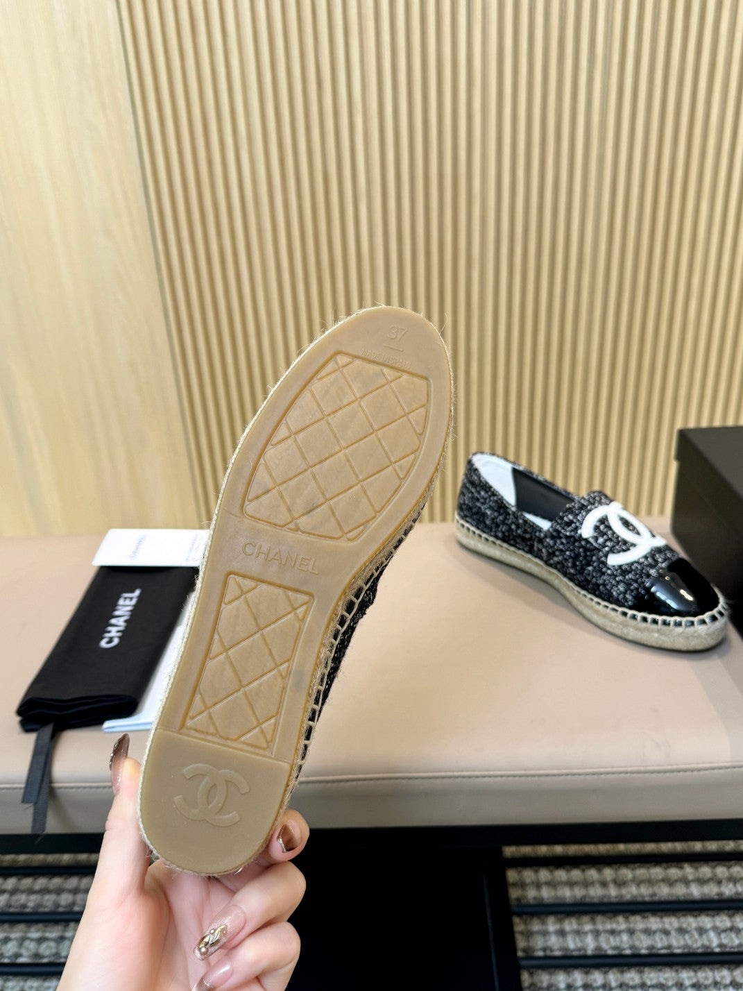 cc espadrilles black white tweed black patent calfskin