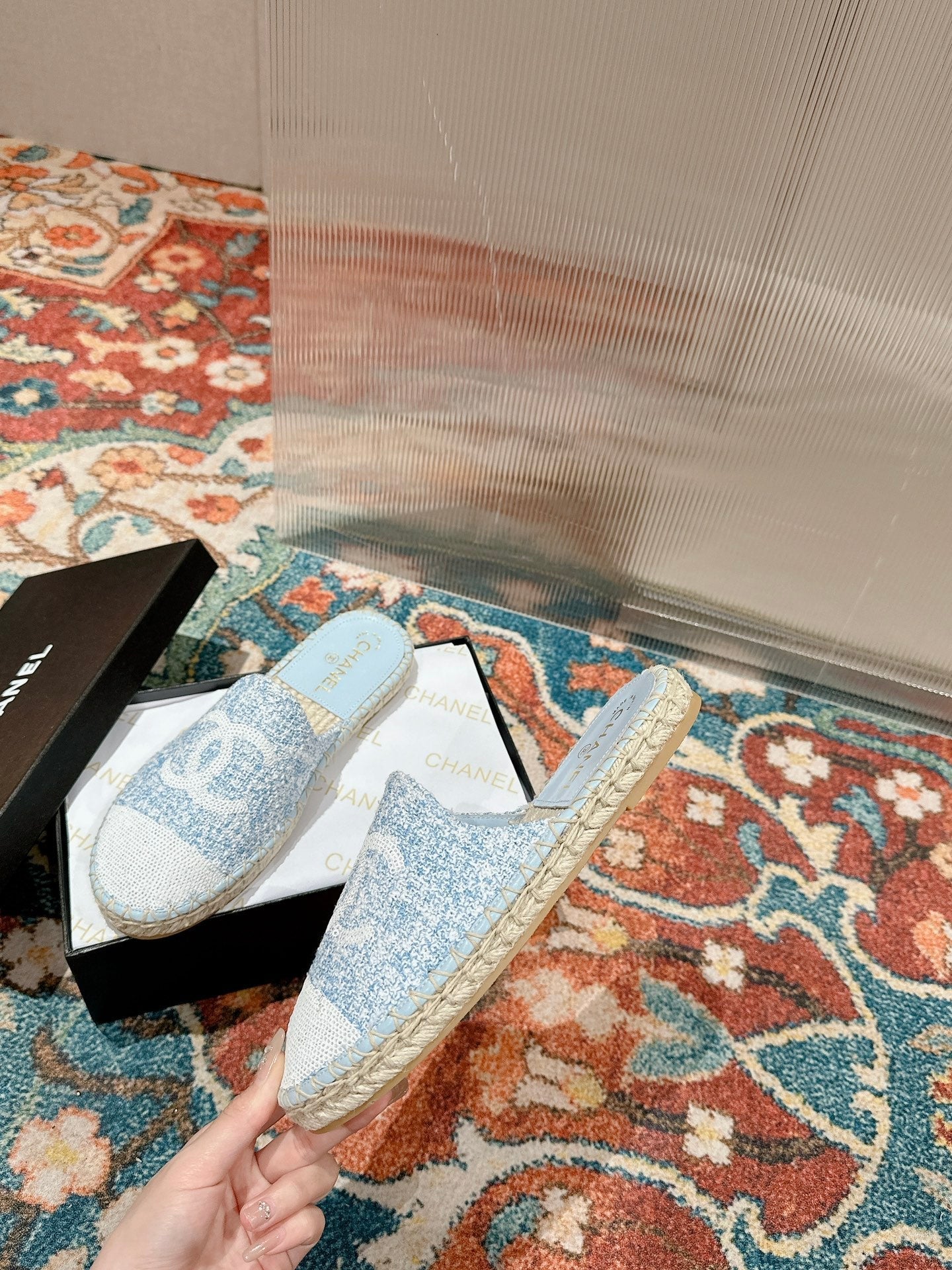 cc espadrilles mule cloud blue fabric white sequin