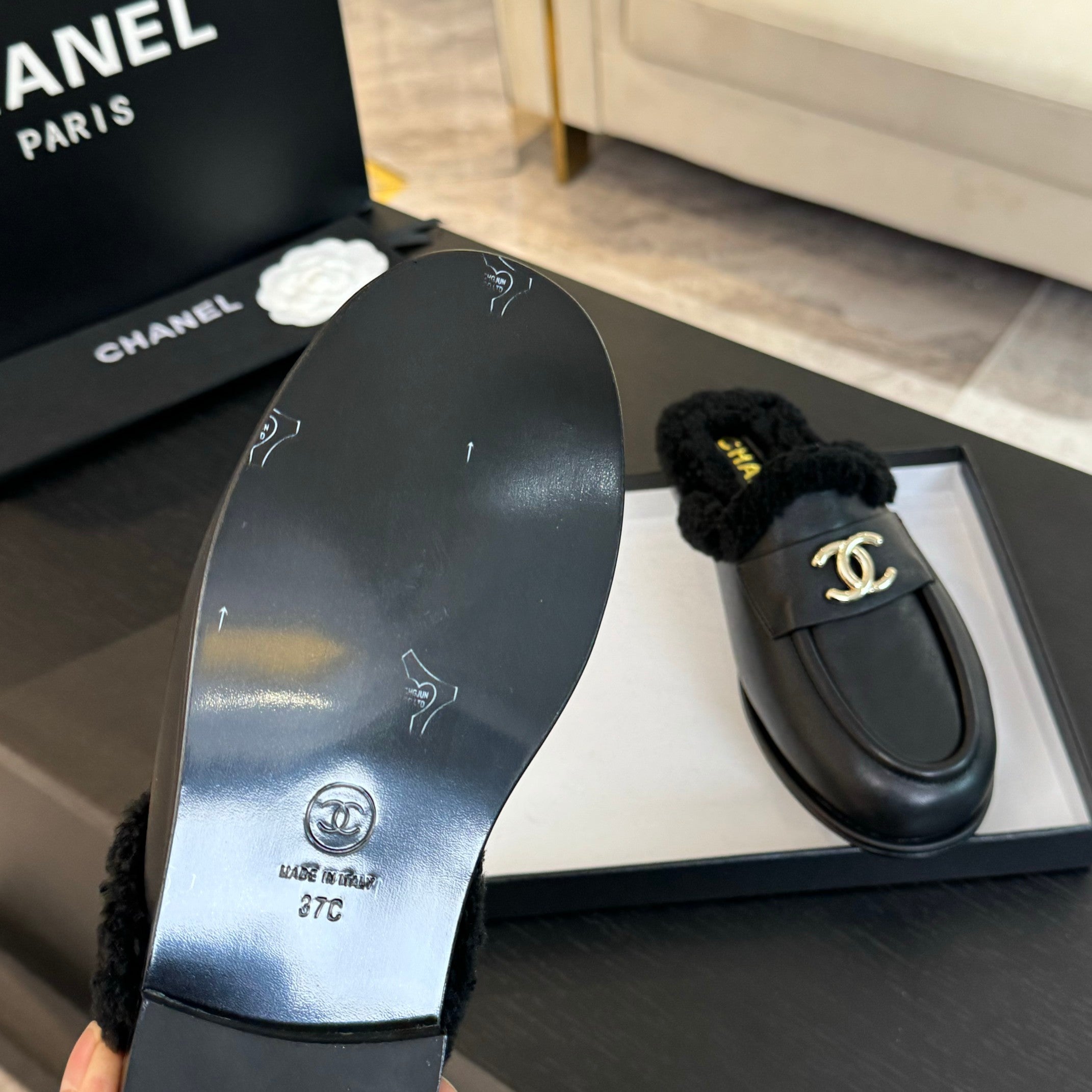 CC Mule Black Calfskin Lamb Wool