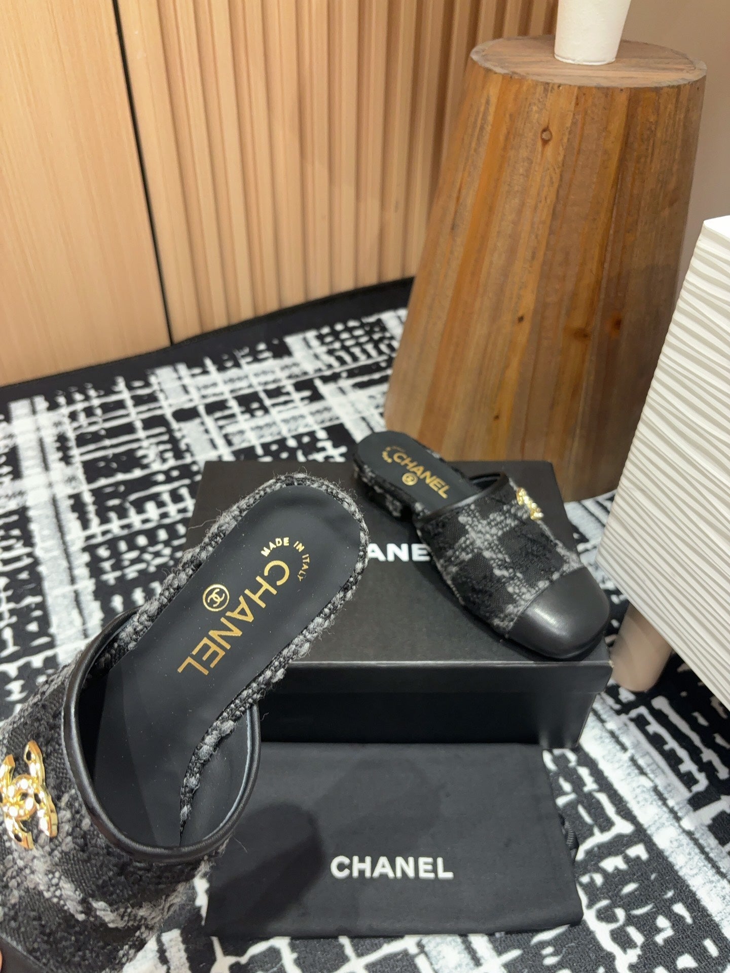 CC Mule 30mm In Black Wool Tweed And Lambskin Gold Hardware