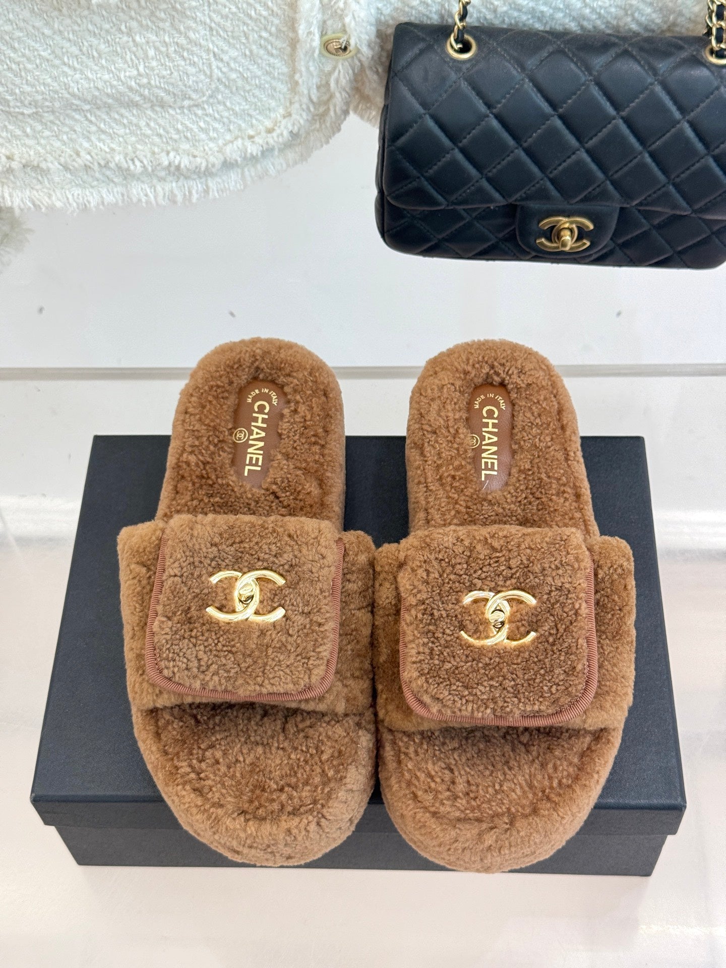 Chanel 25 Buckle Flip-up Thick-soled Slippers Brown Wool 465384