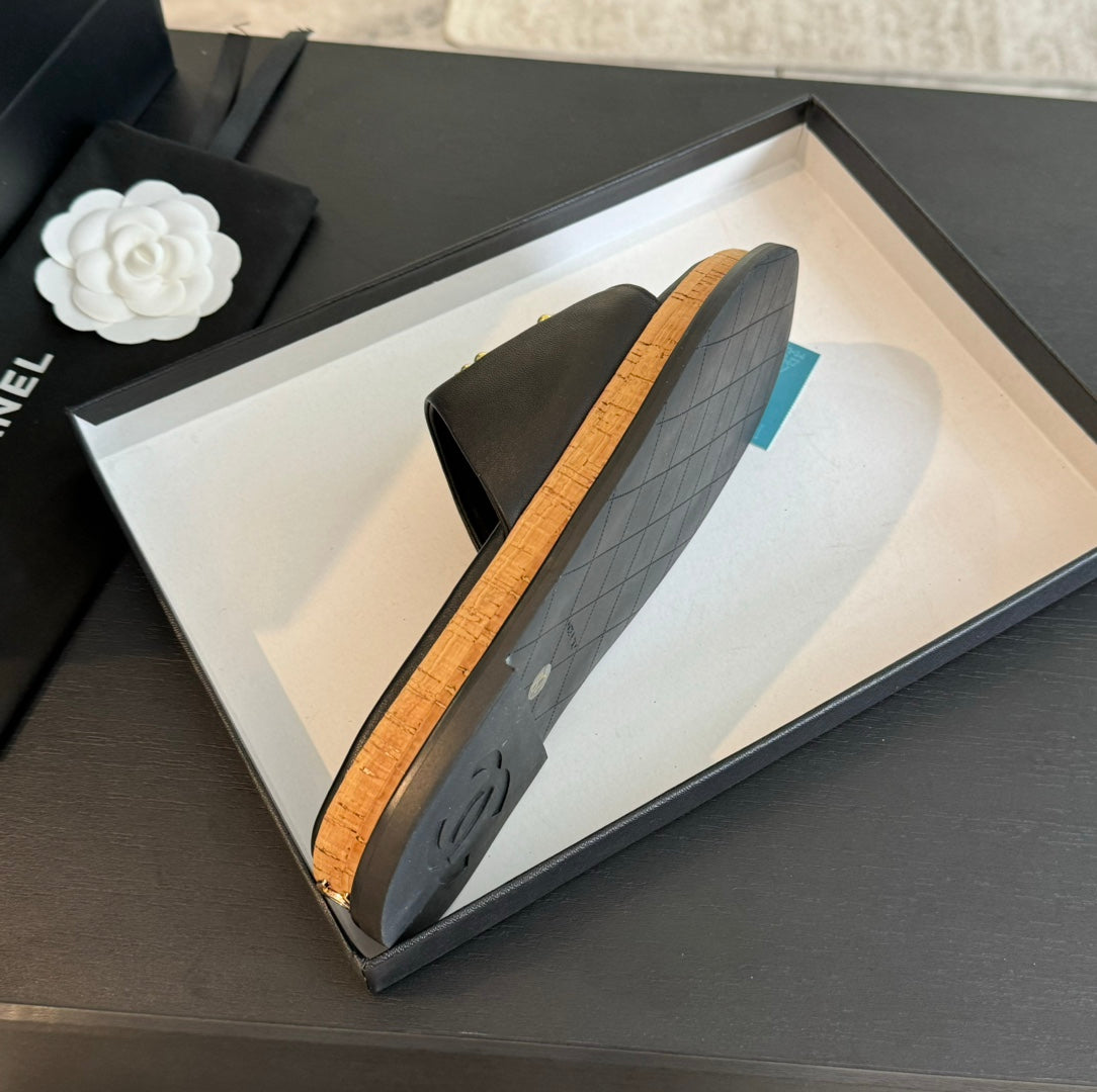 Double C Wood Grain Platform Slippers Black Sheepskin