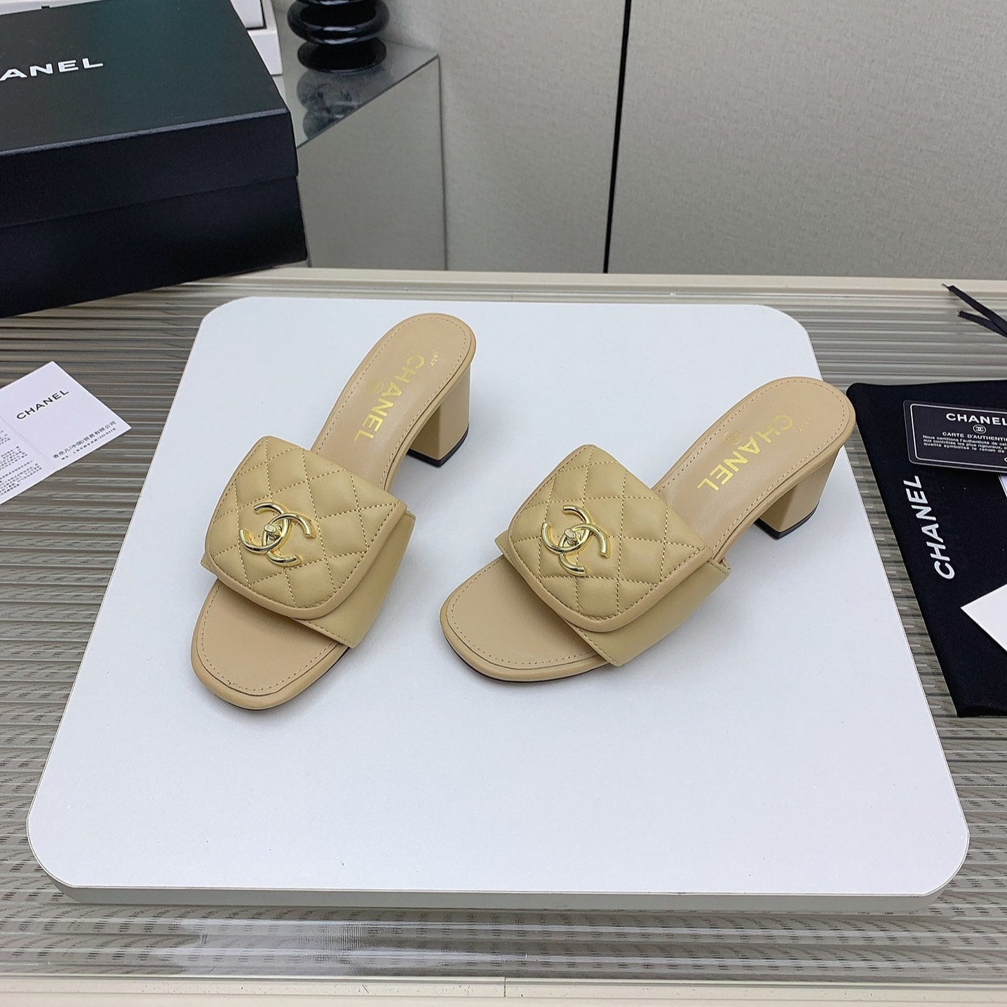 CC Mule Sandals 50mm In Beige Quilted Lambskin 148946