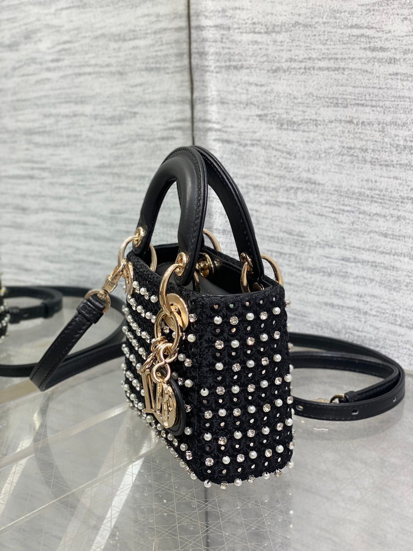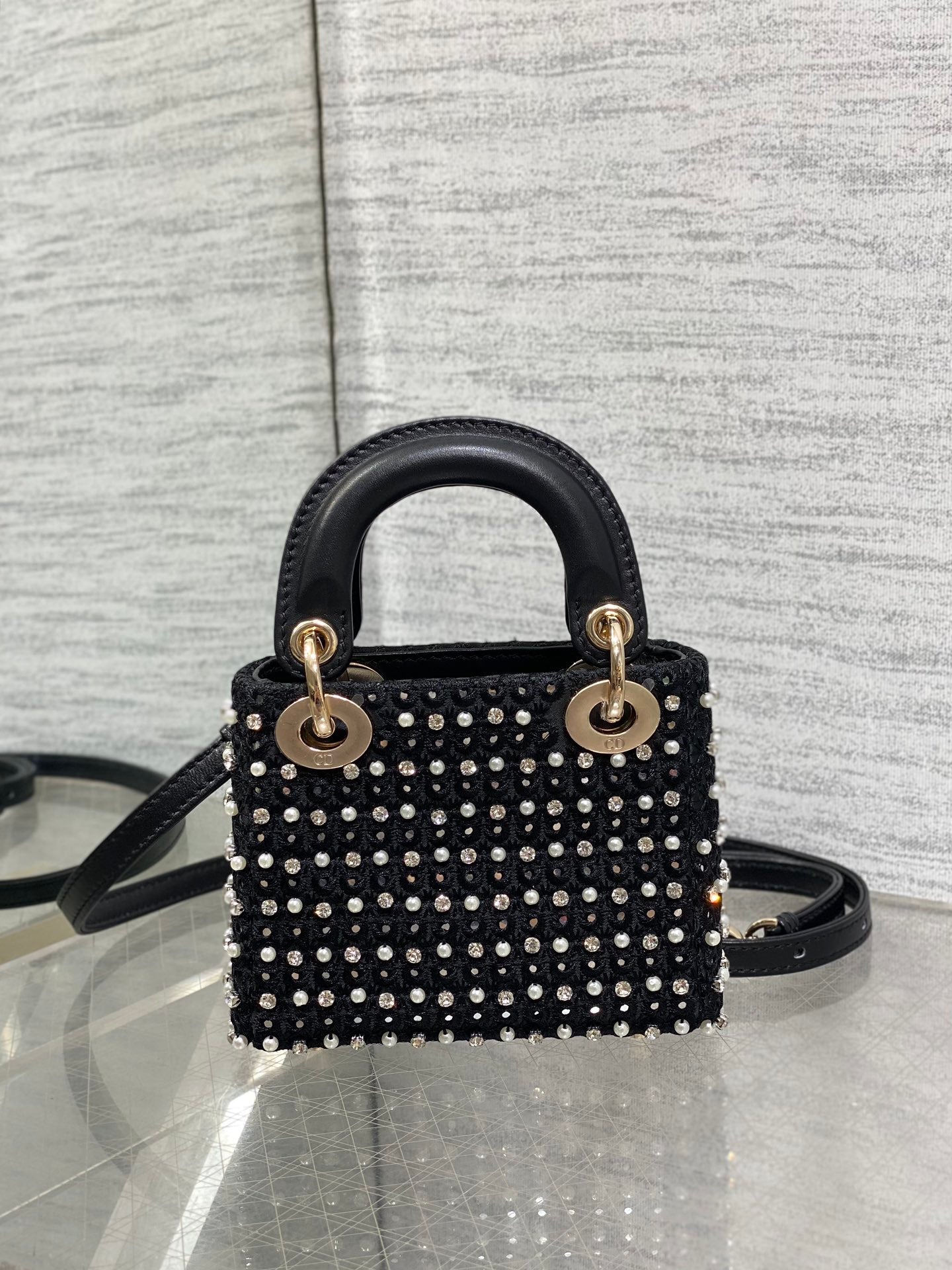 Lady Micro Bag 10cm Black Fabric Embelished With Crystal/ Pearl