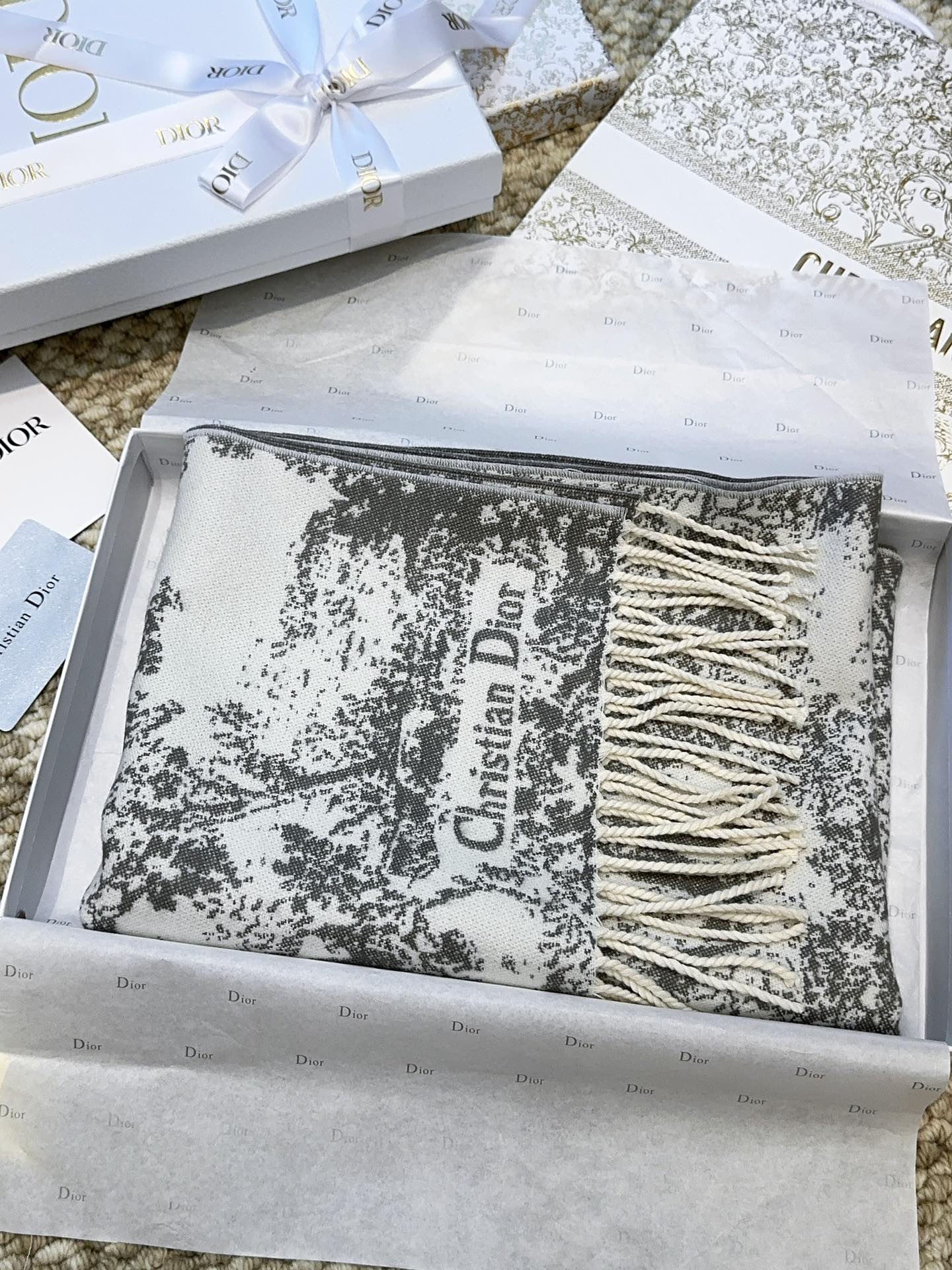 SCARF 220 CM IN WHITE MIX LIGHT GRAY MONOGRAM CASHMERE AND WOOL 413657