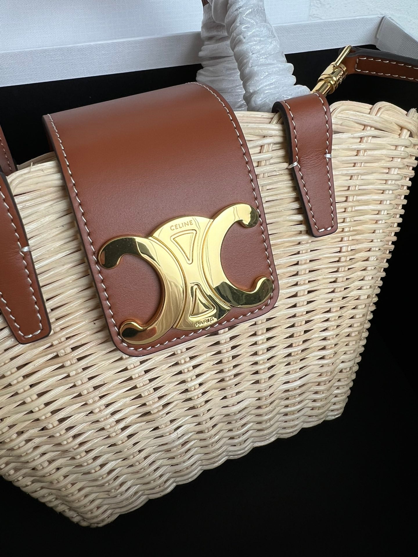 Celine Classic Panier 47cm Braieded Triomphe Beige Raffia Brown Calfskin