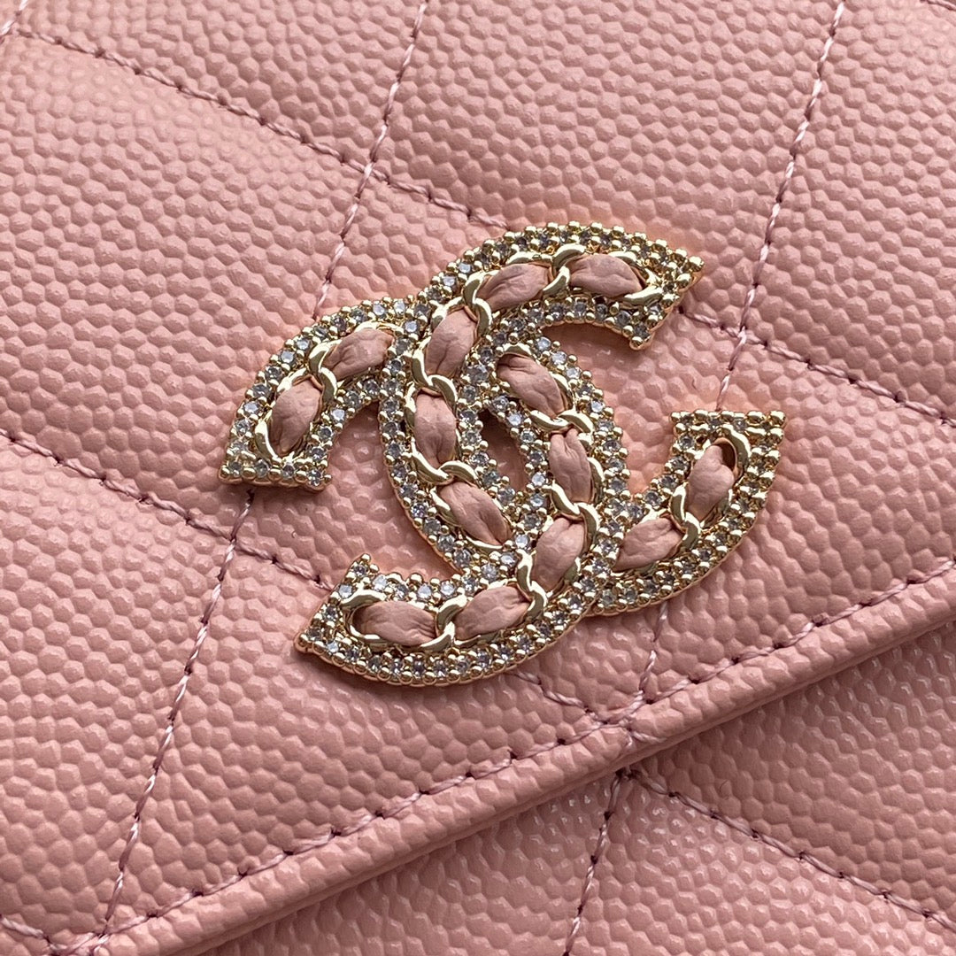 CC FLAP CARD HOLDER 11 PINK GRAINED CALFSKIN GOLD ICON