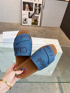 CHLOÉ WOODY MULE IN COBALT BLUE DENIM WITH EMBROIDERED LOGO