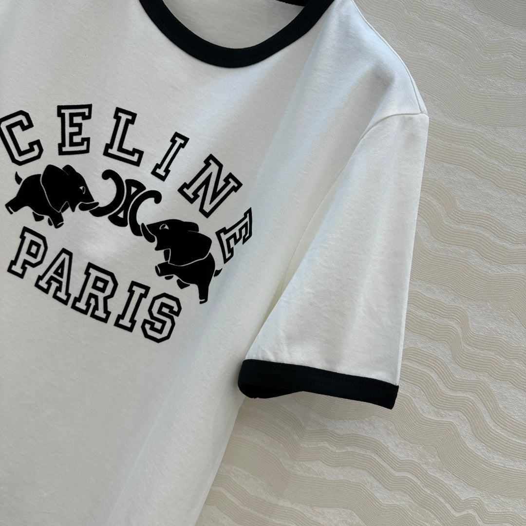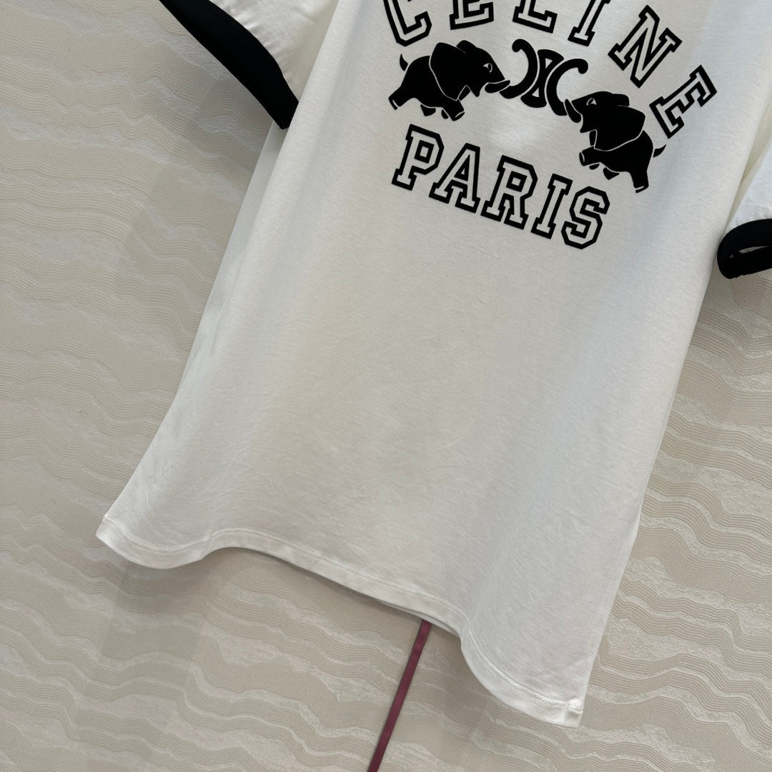 Celine Elephant Letter Flocking Short-sleeved T-shirt White mix Black Cotton