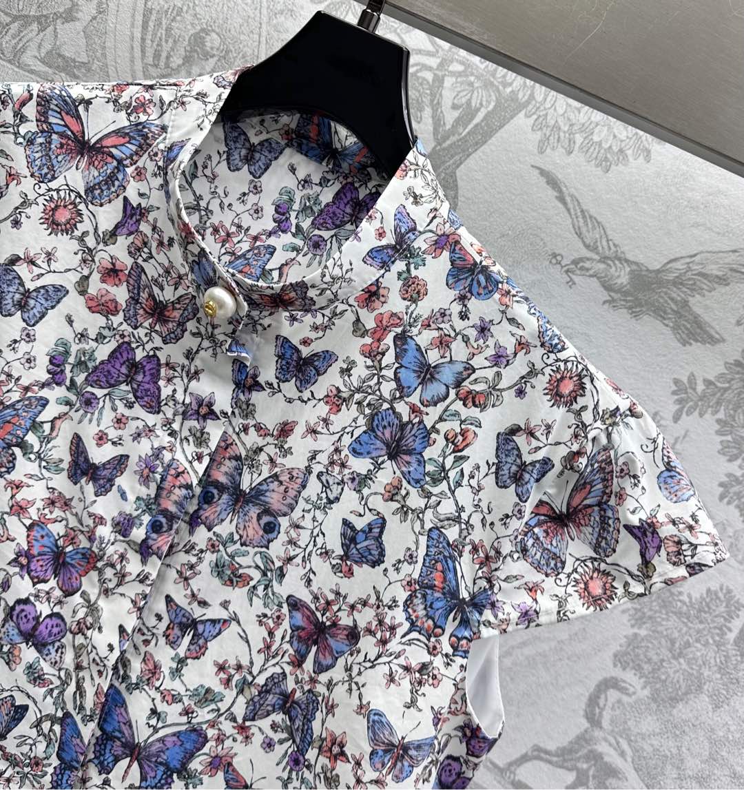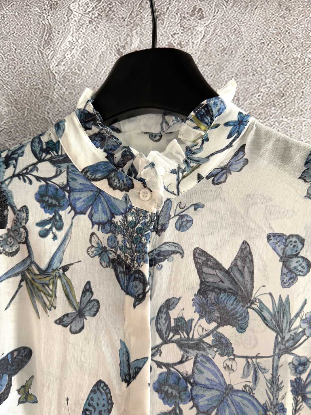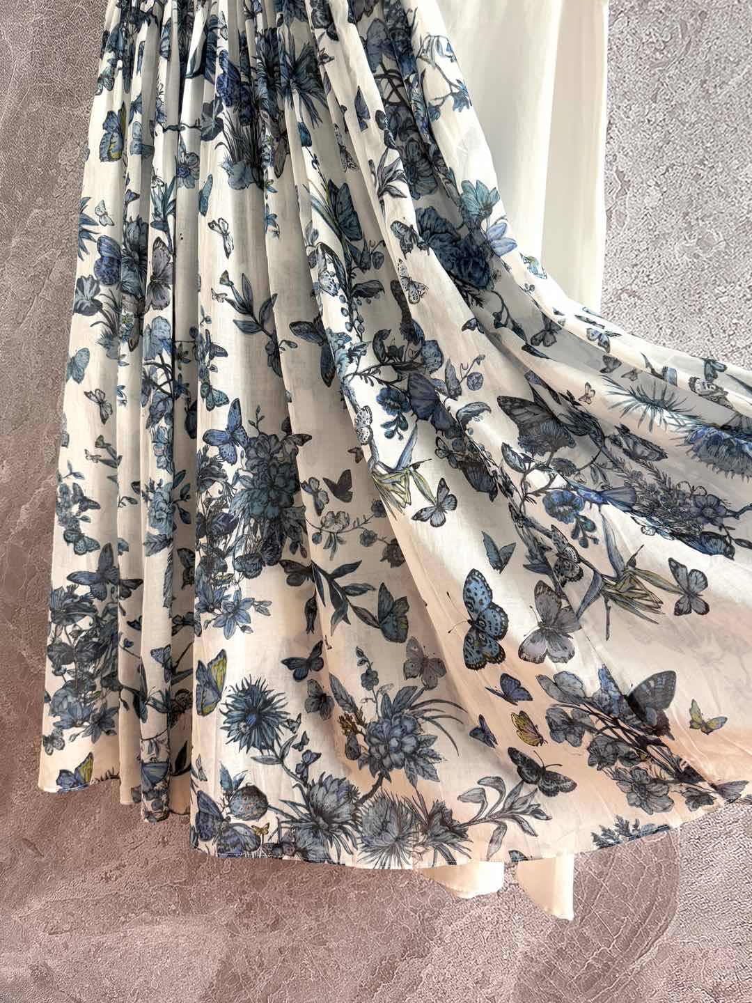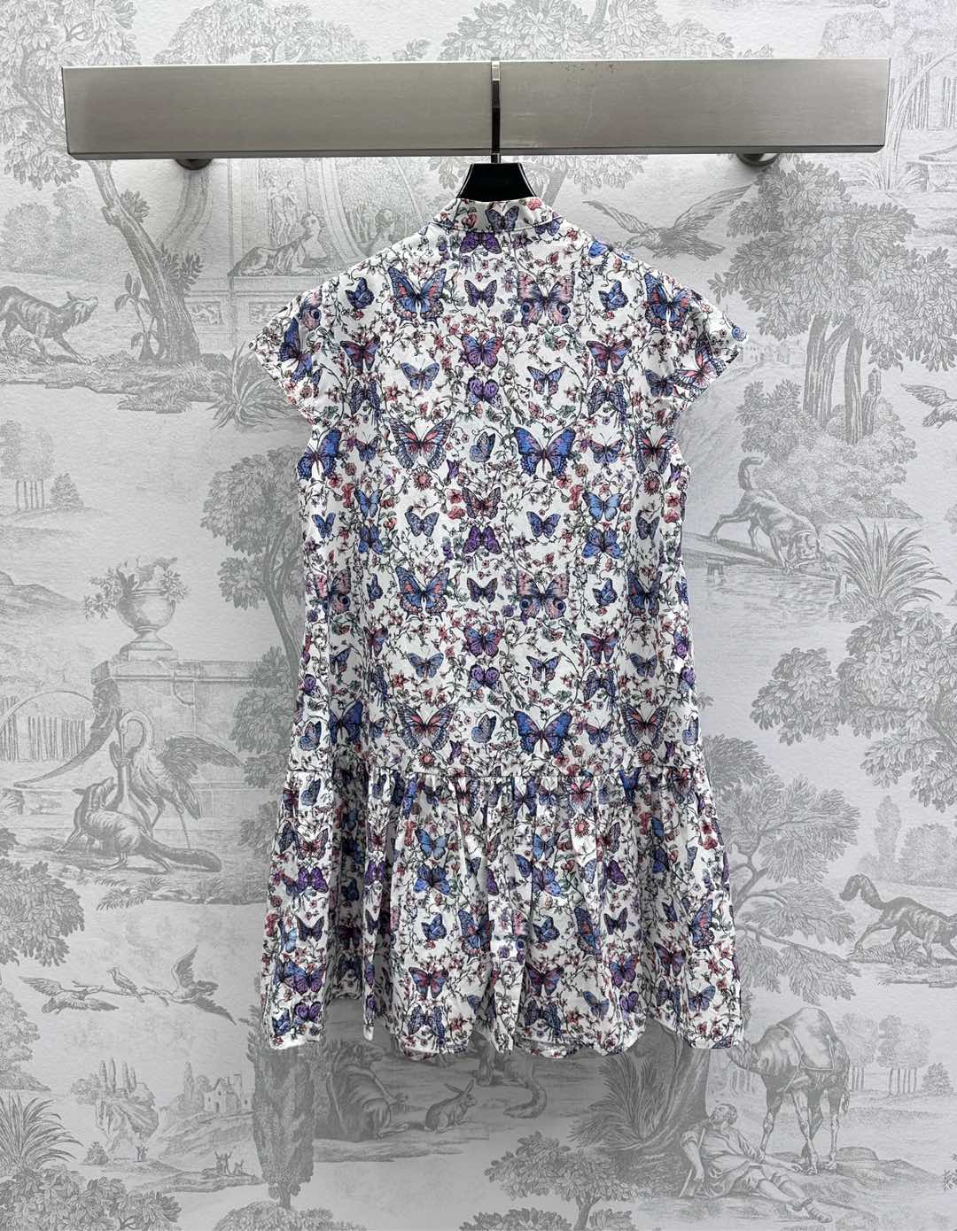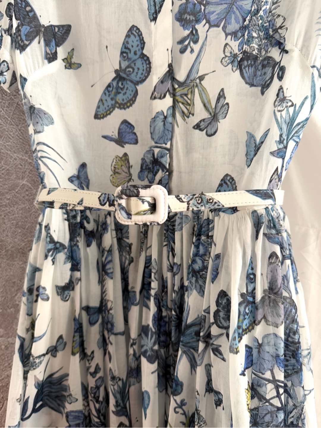 CD Short Dress White Cotton Muslin with Blue Butterfly Motif