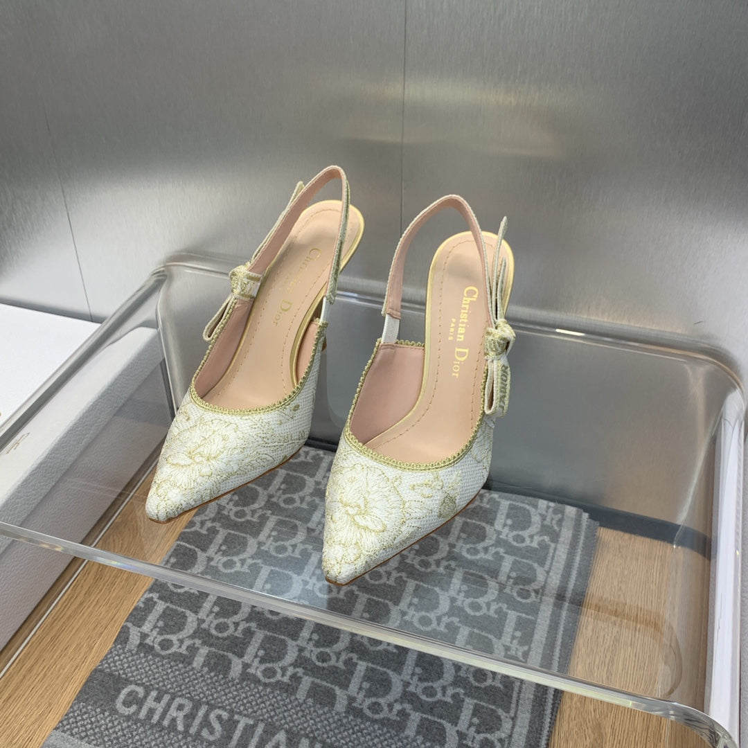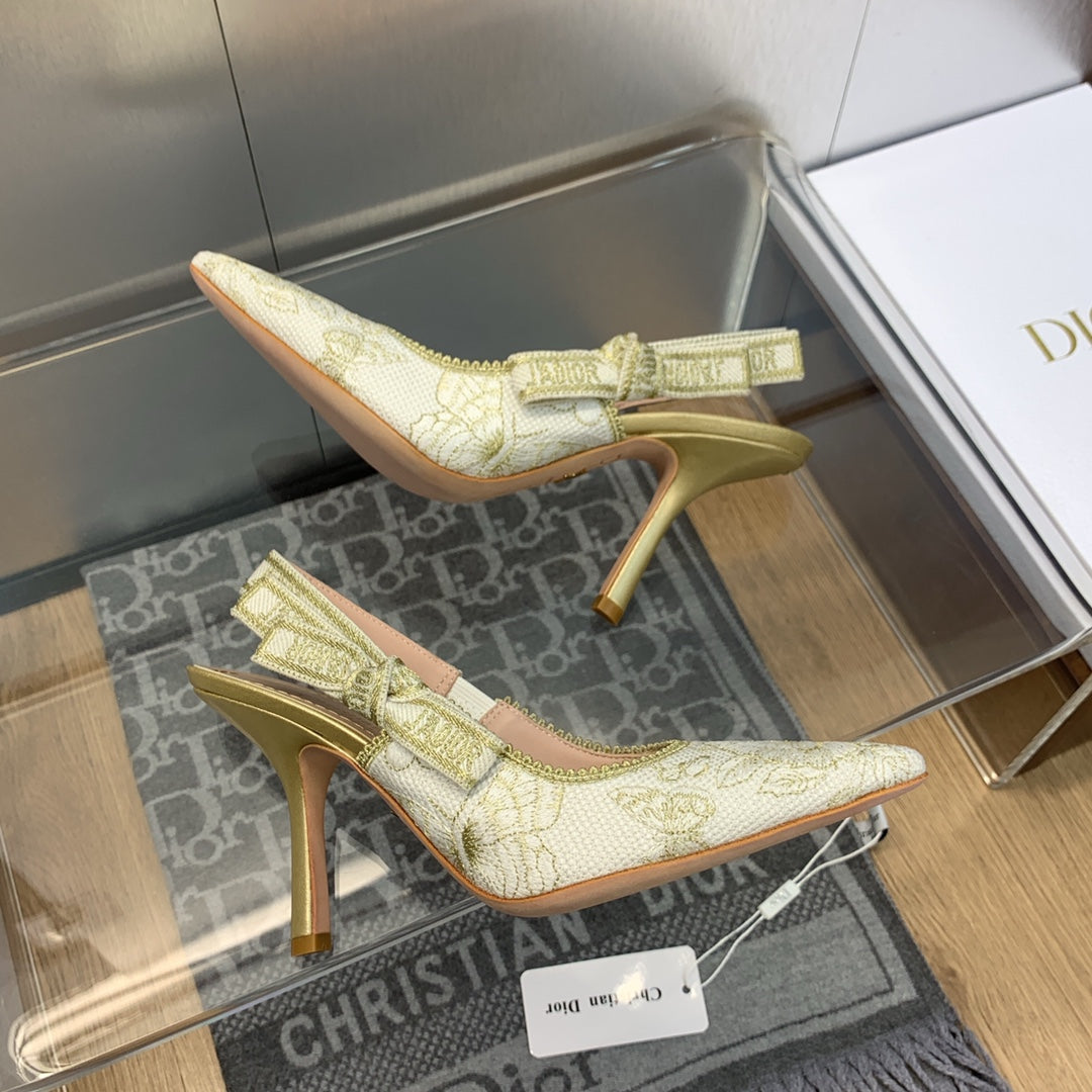 JAdior Slingback Pump 95 White and Gold-Tone Toile de Jouy Mexico Embroidered Cotton with Metallic Thread