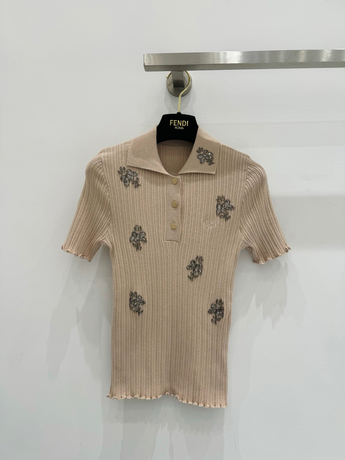 Fendi Beaded Flower V-neck Knitted Small Top Black Gray Wool