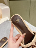 FENDI SIGNATURE MULE SLIDES IN BEIGE FIBRE WITH BROWN EMBROIDERED LOGO