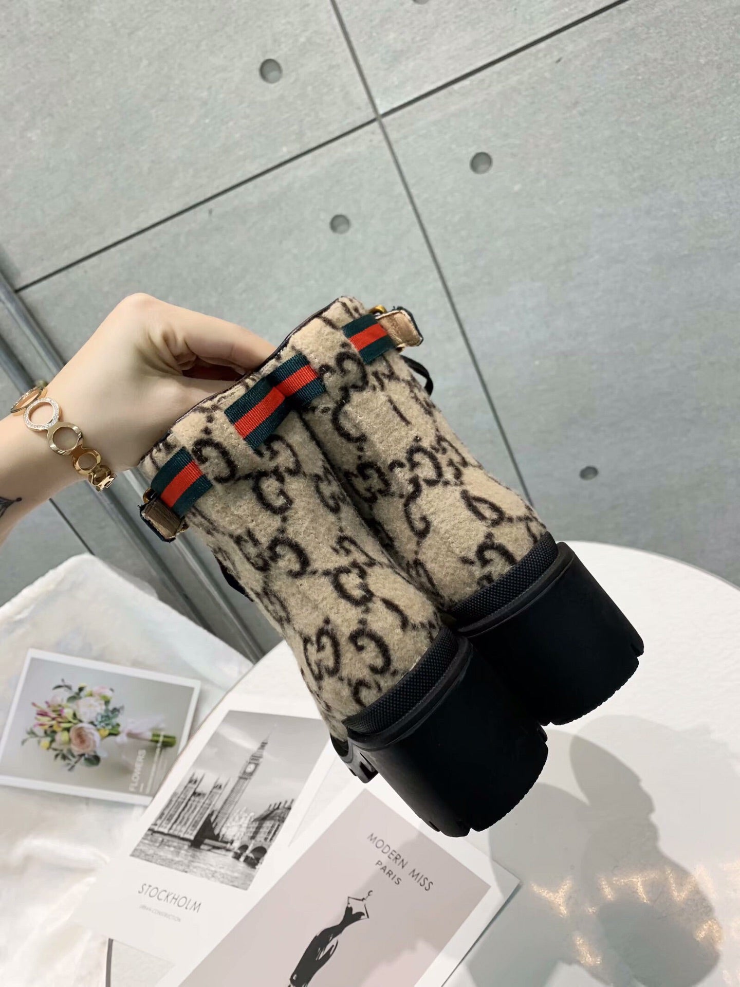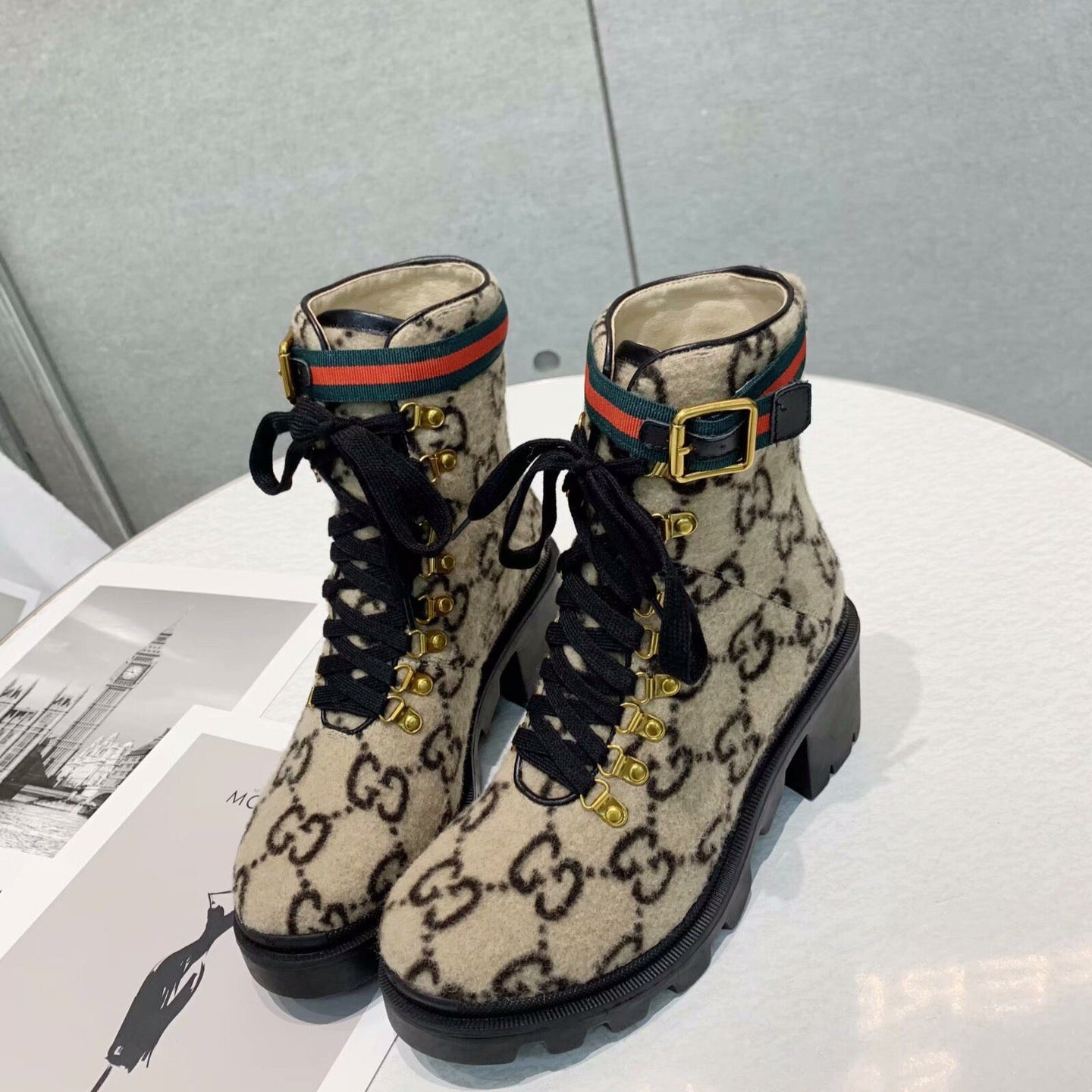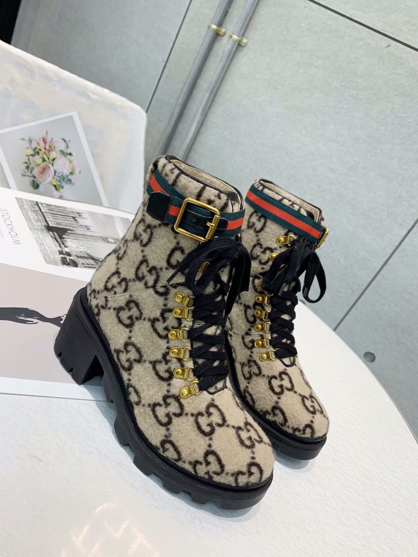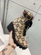 GG Ankle Heel Boots Beige Black Velvet