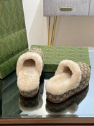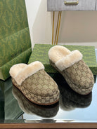 GG MOLLY MULE IN PEANUT BROWN MONOGRAM JACQUARD FABRIC AND SHEARLING LINING