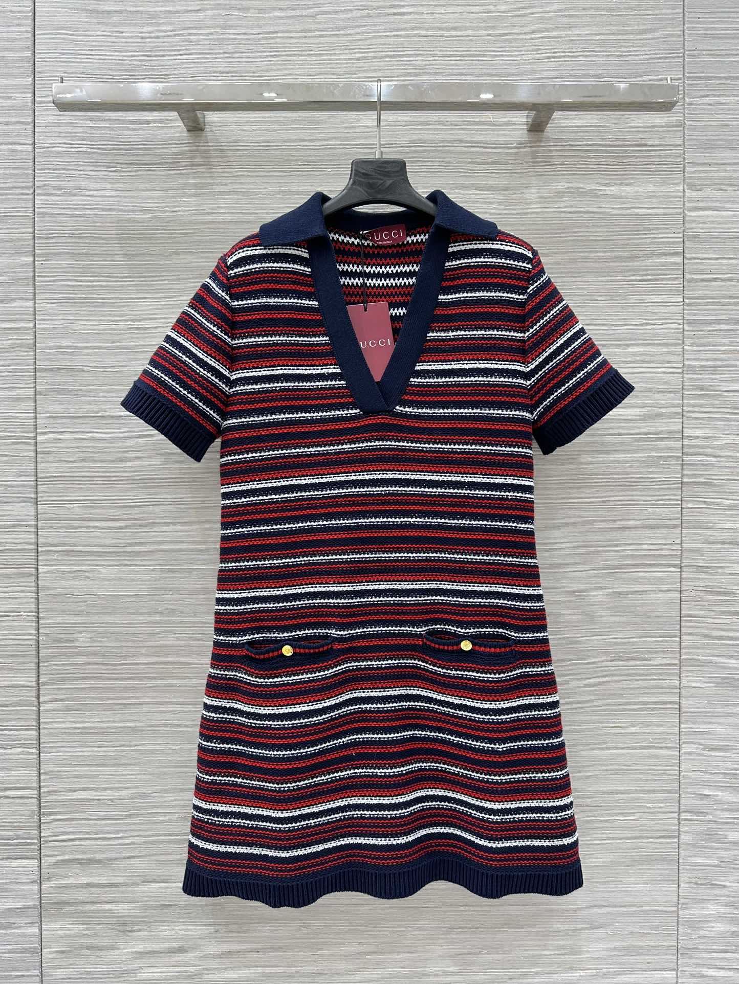 Gucci 25 Knitted V-neck Dress White Red Wool