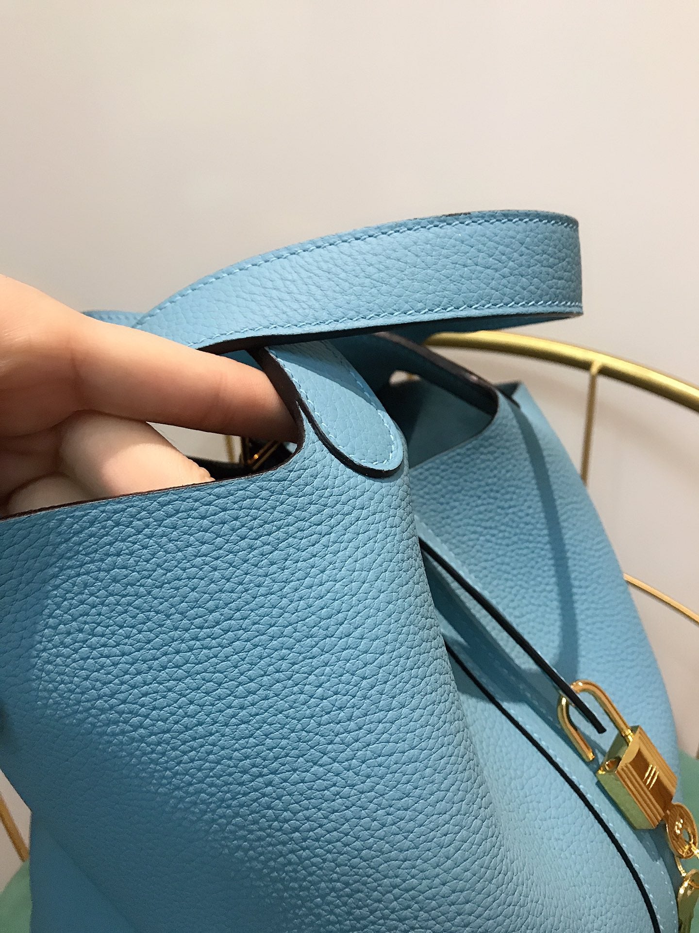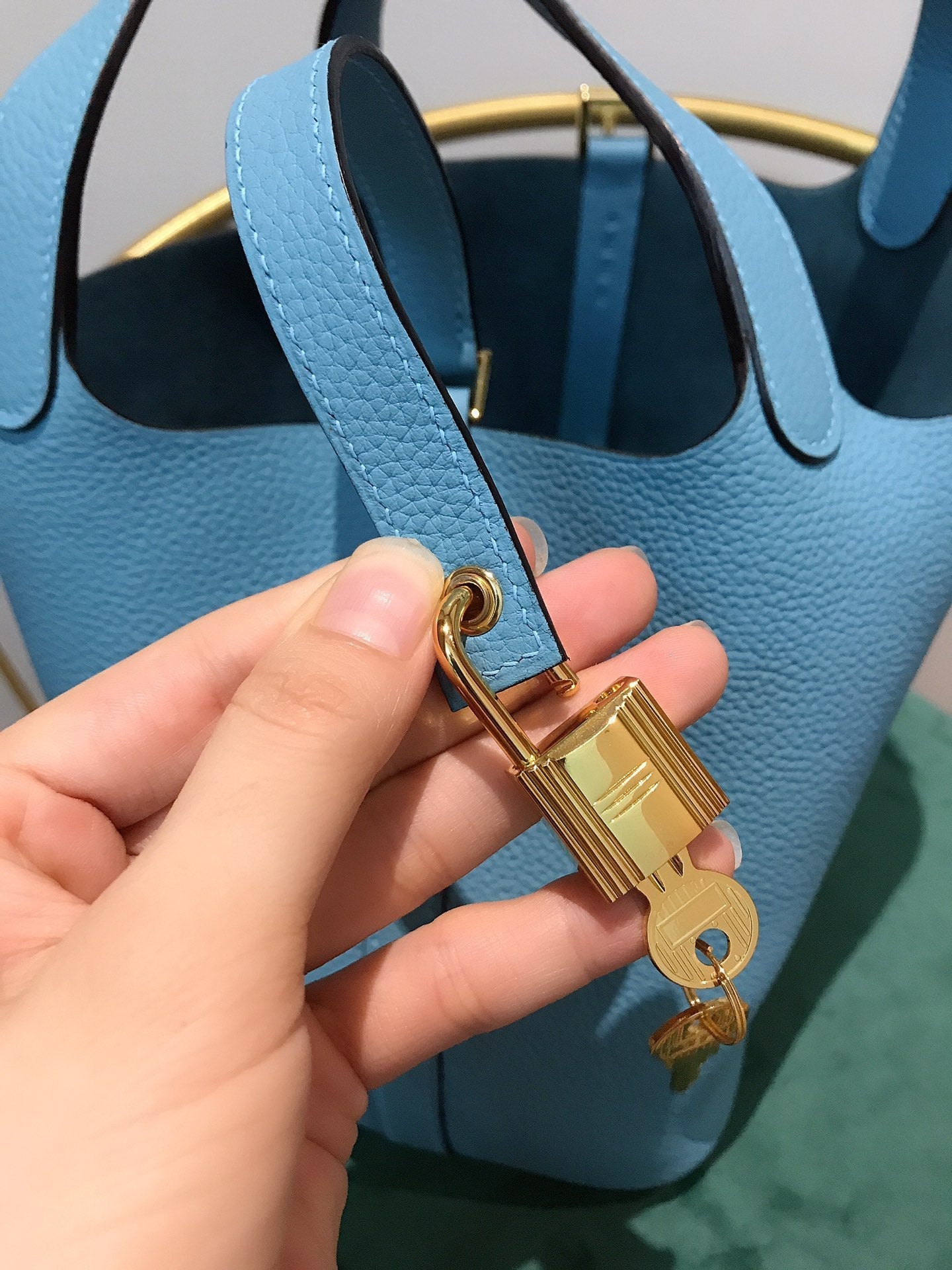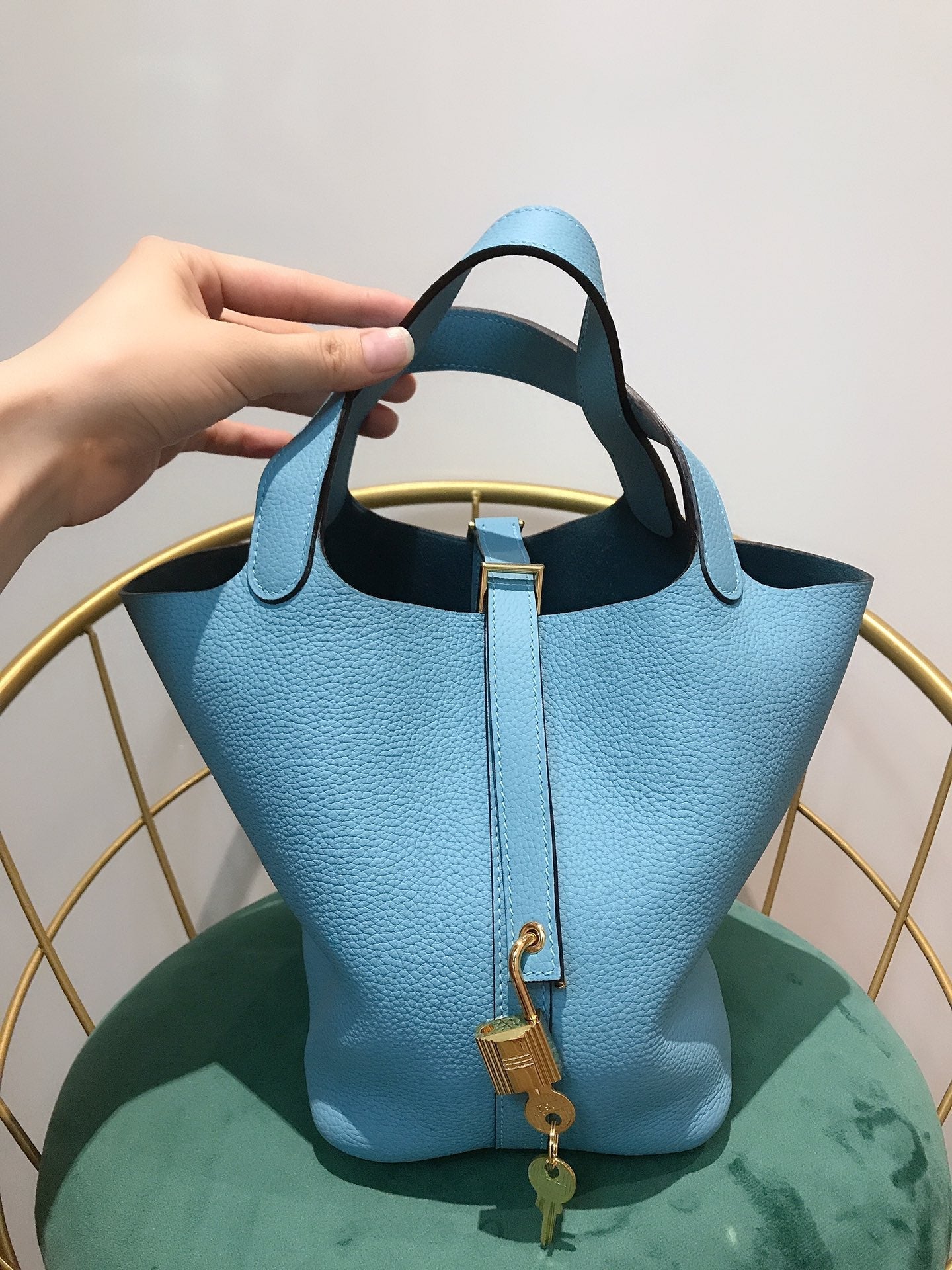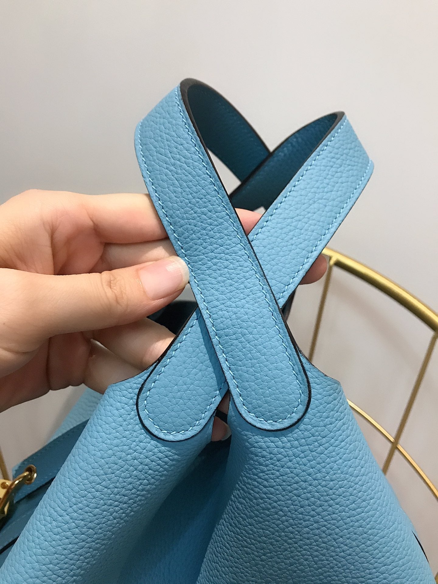 • Color: blue sky color, gold hardware