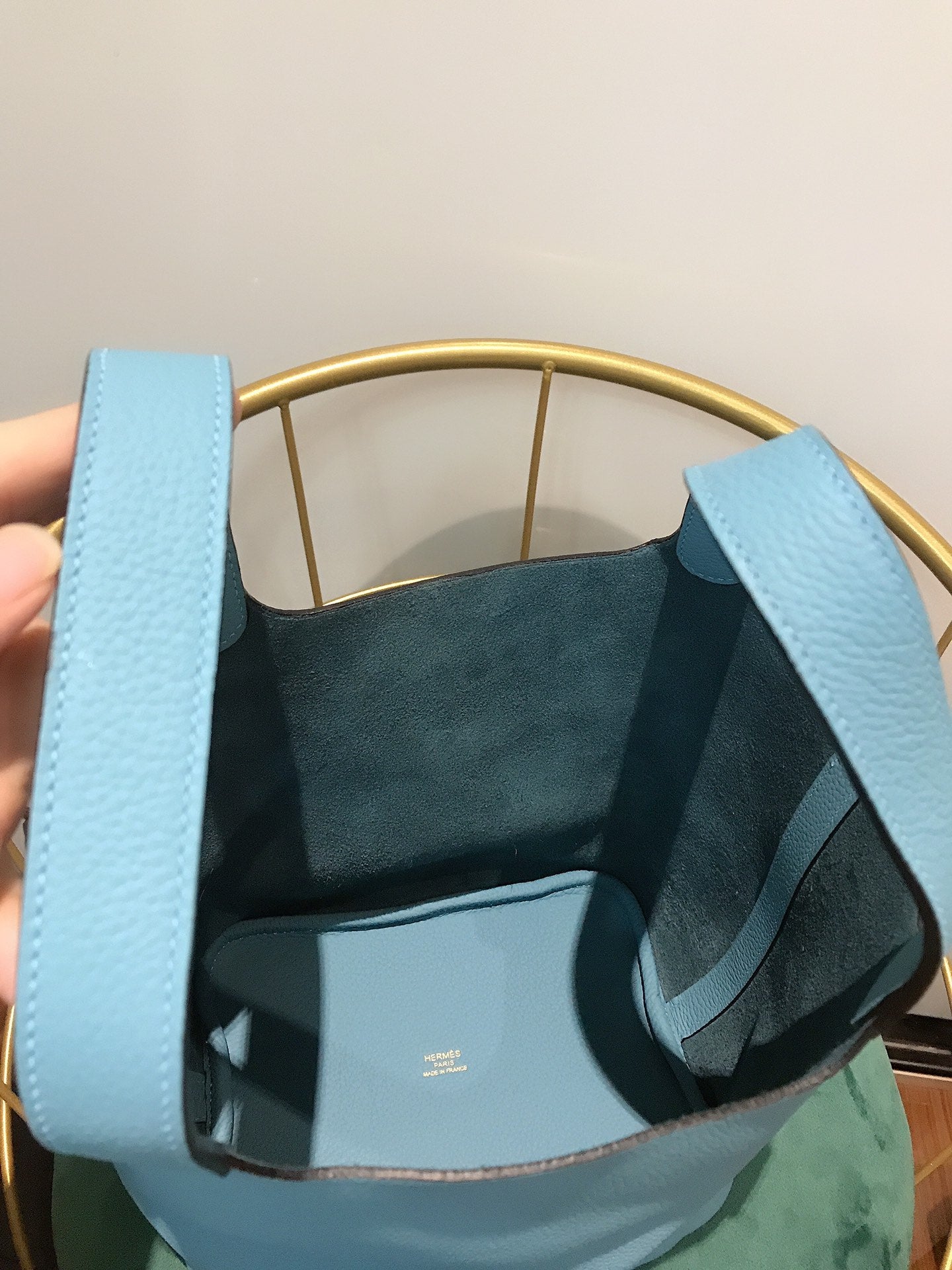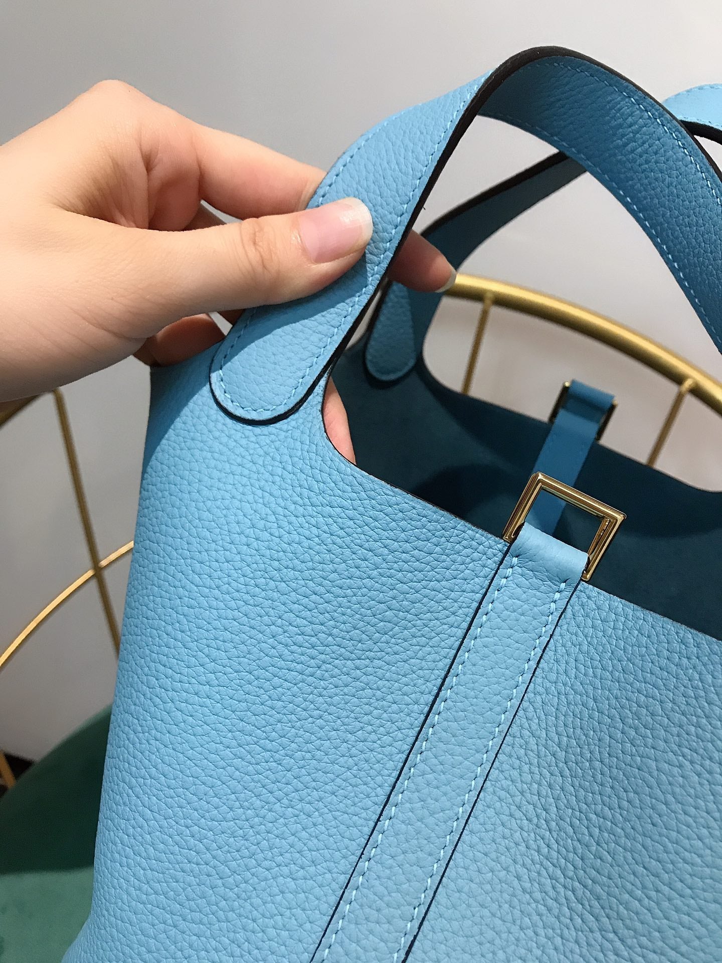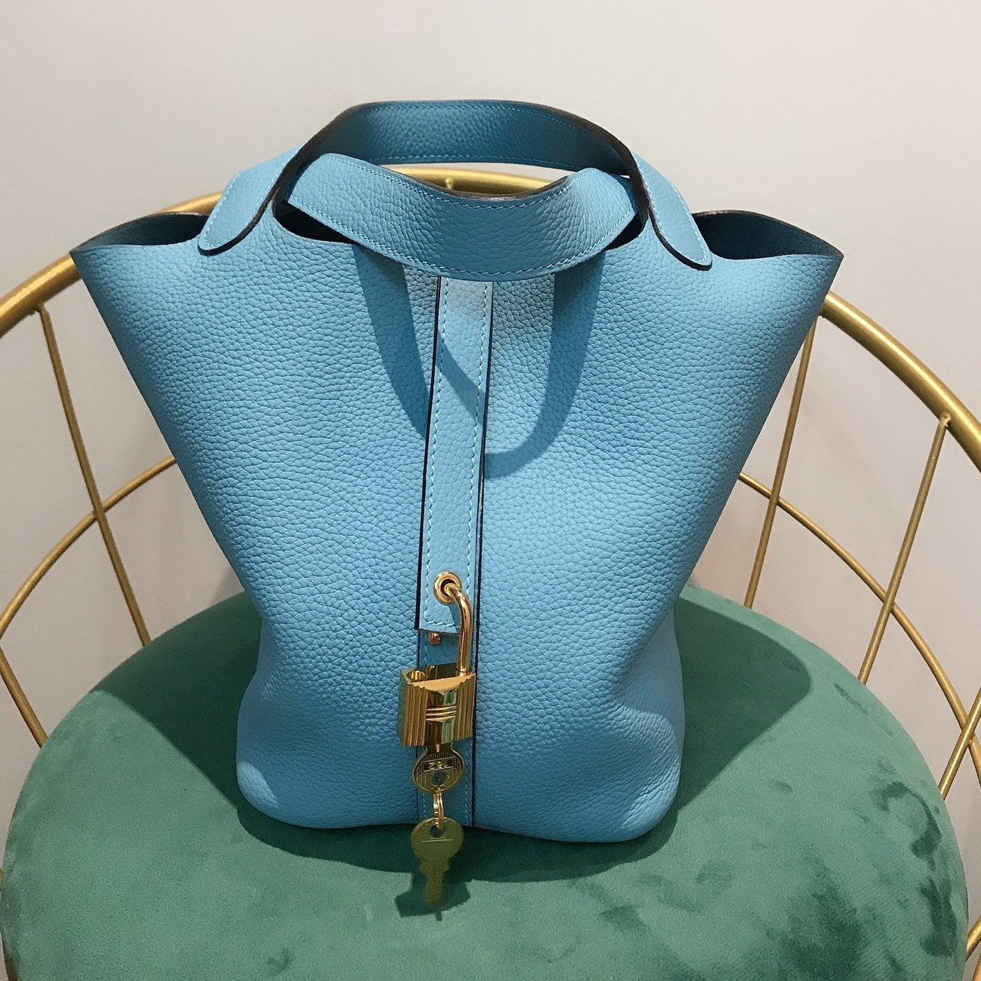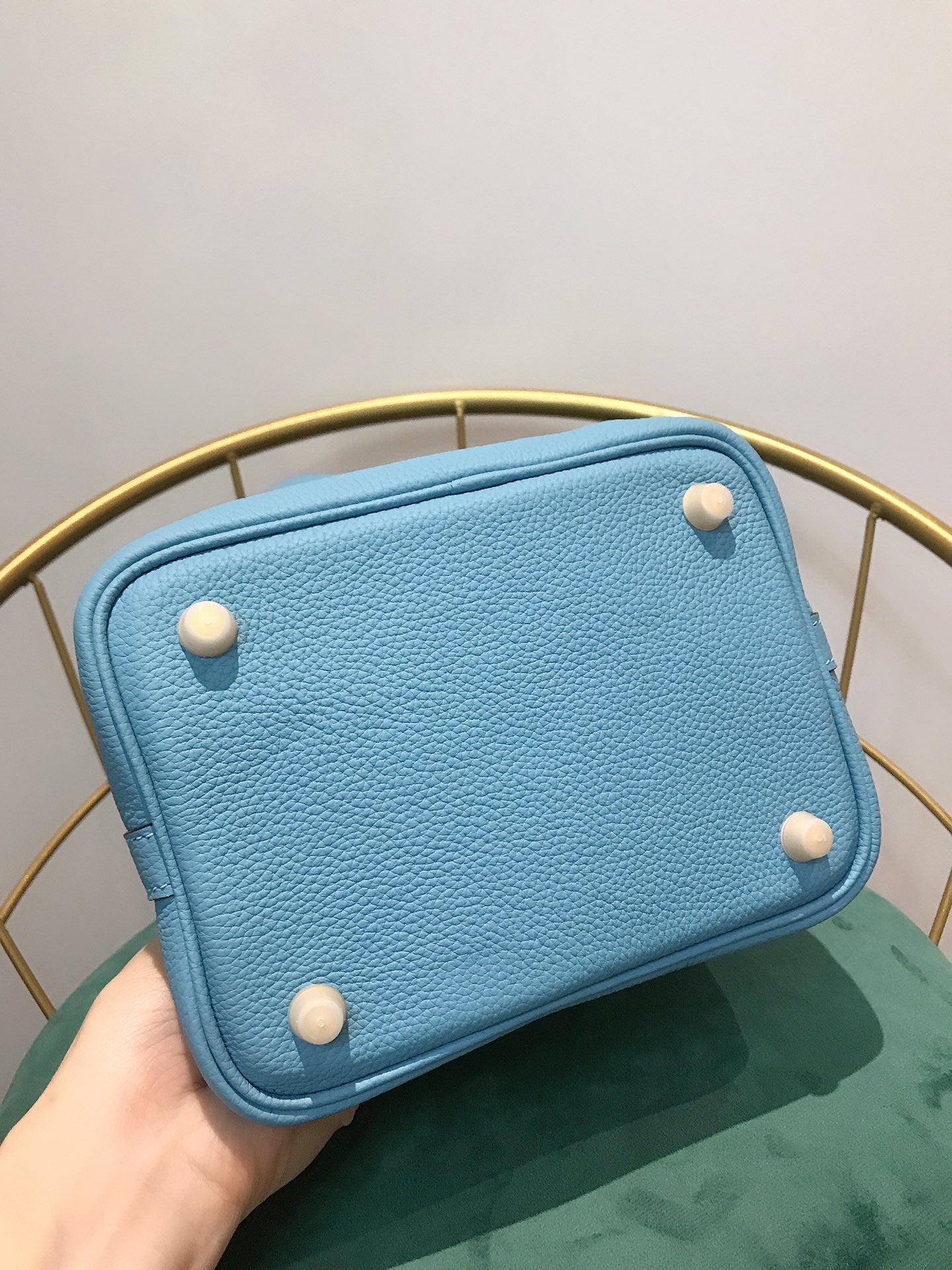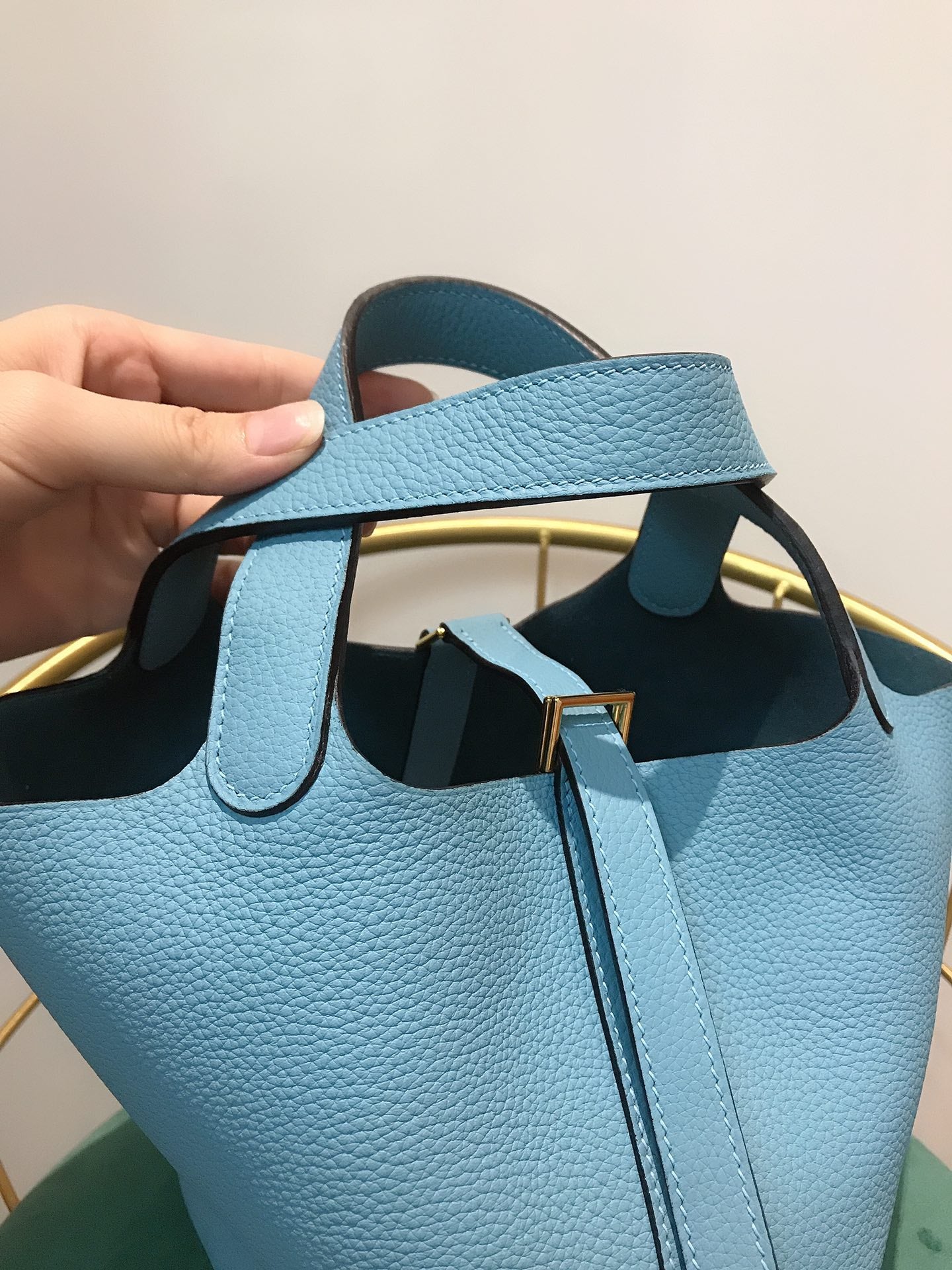 • Color: blue sky color, gold hardware