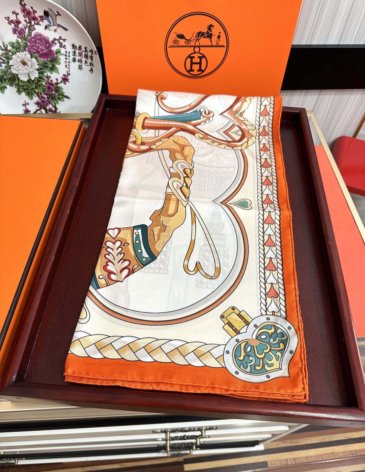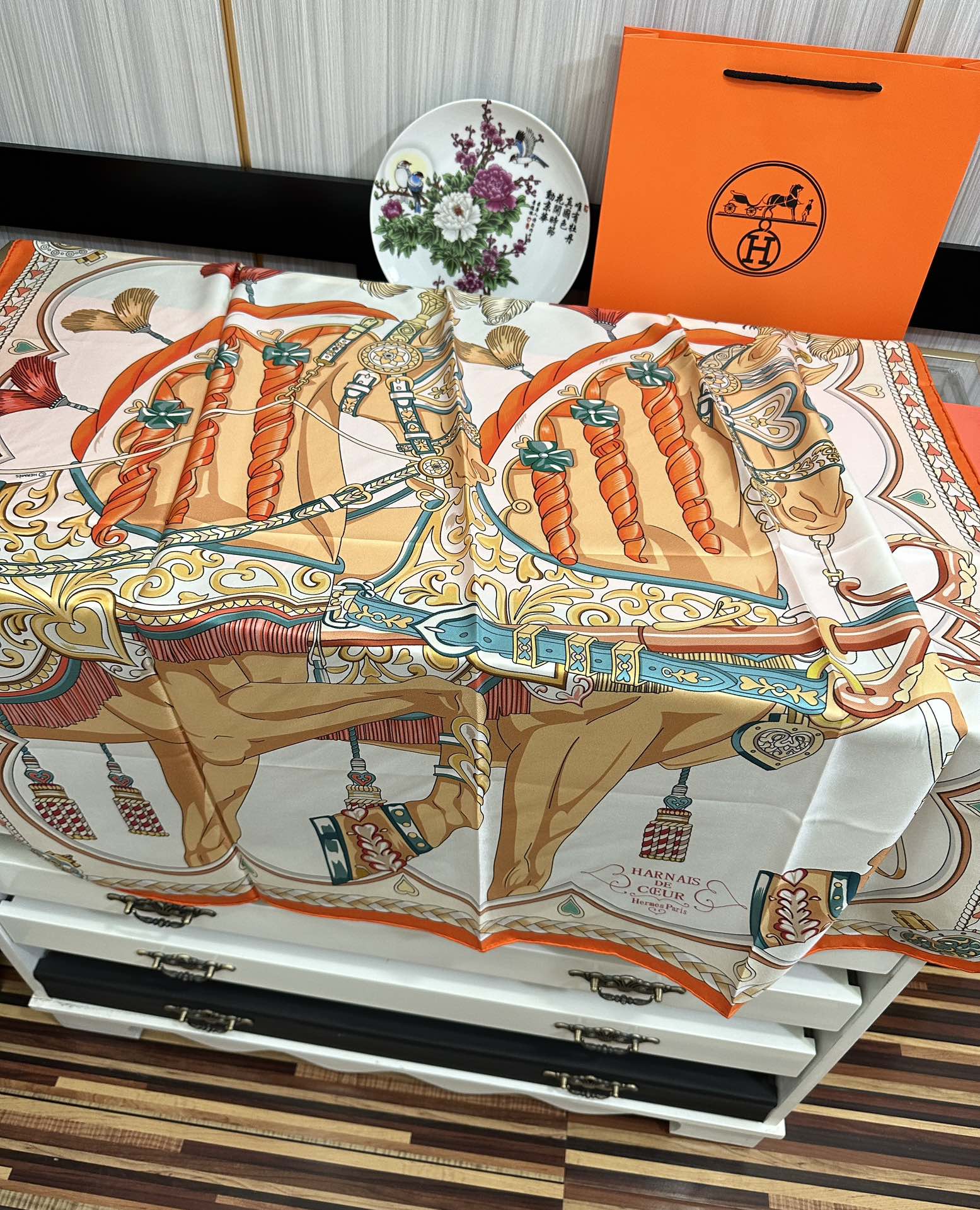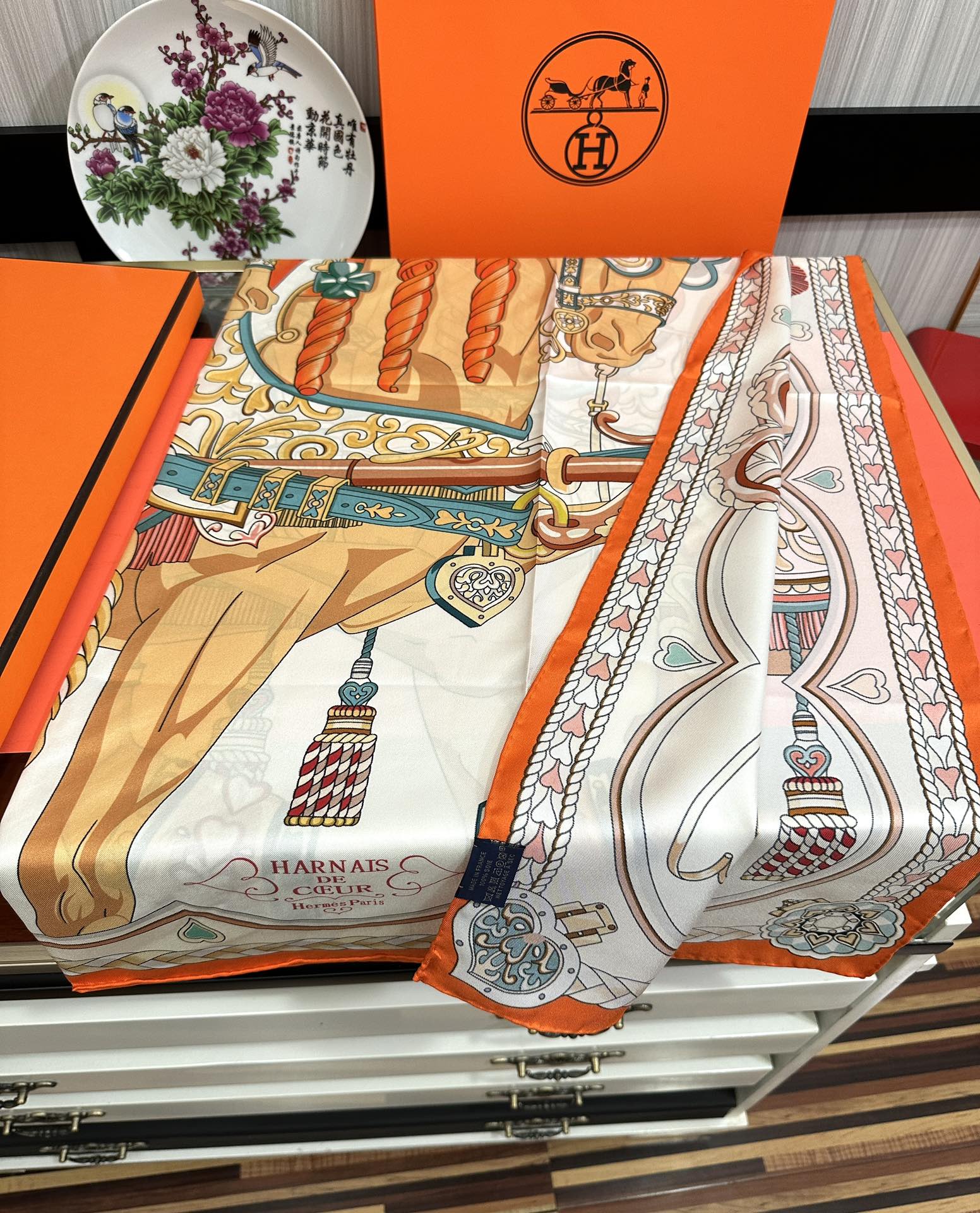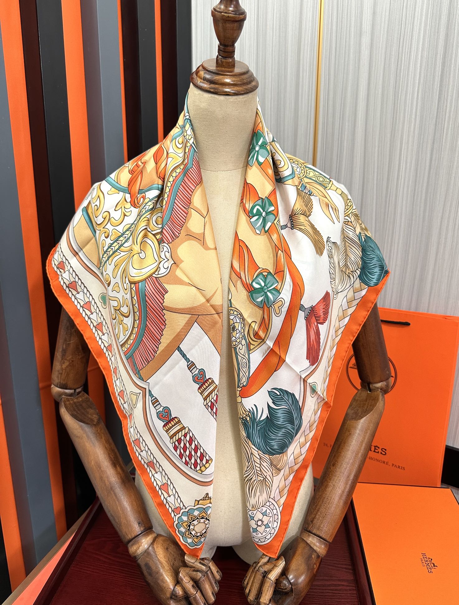 Carré Harnais De Cœur Scarf 90 CM In Orange Colorful Silk 306470