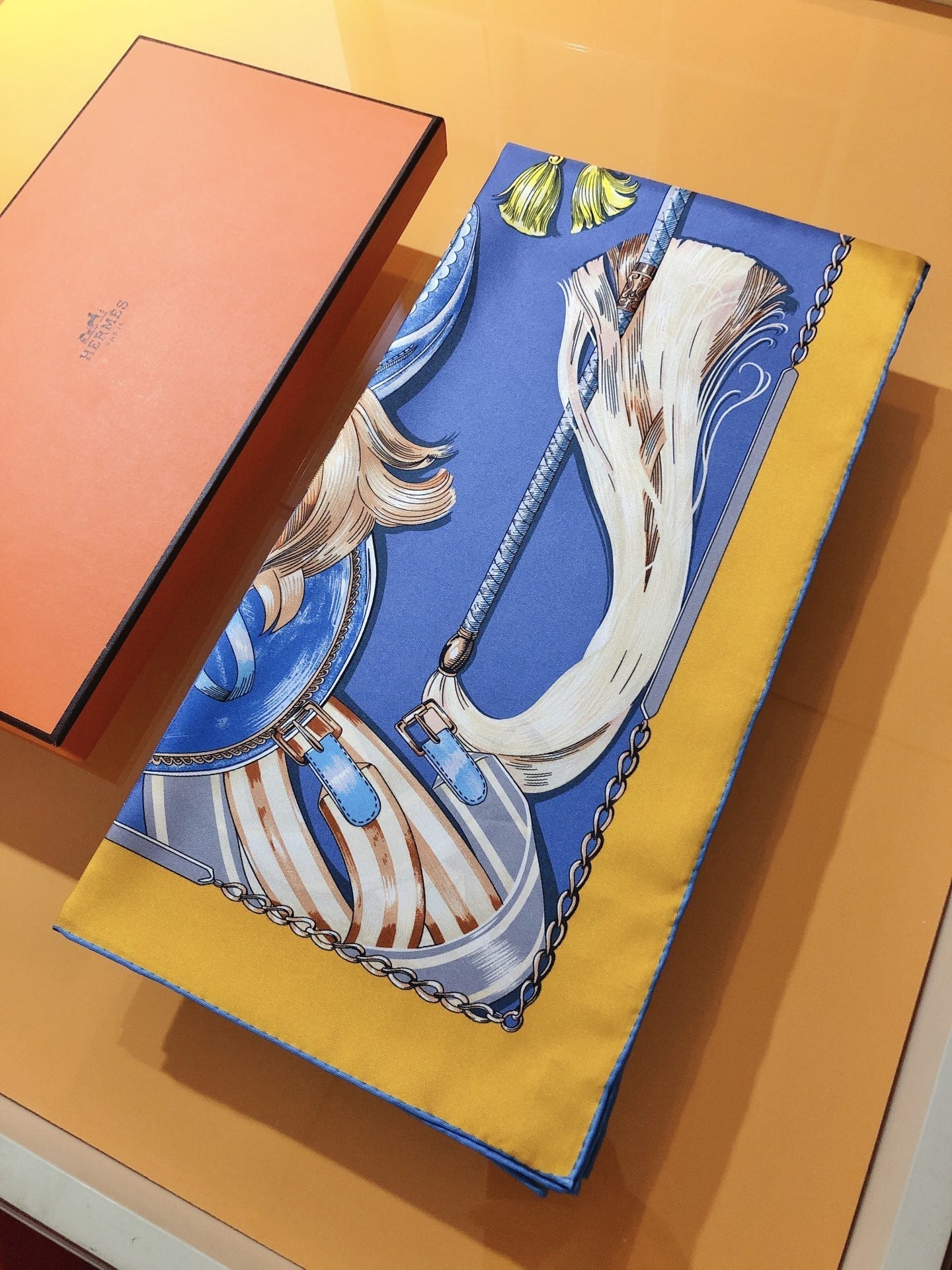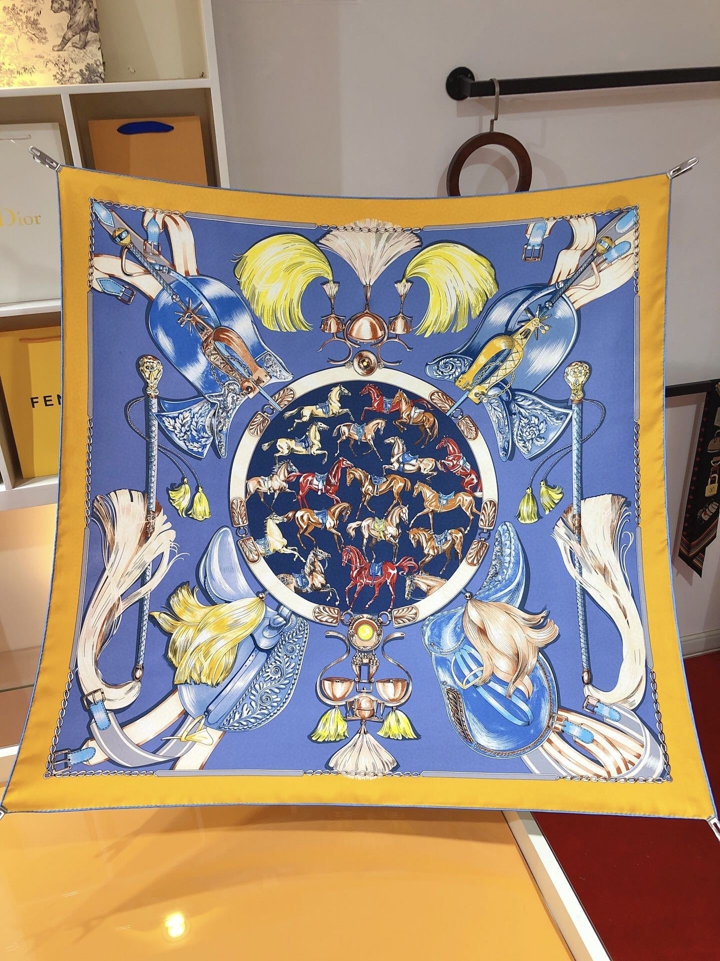 Cavalcades Scarf 90 CM In Blue Yellow Colorful Silk Twill 288859