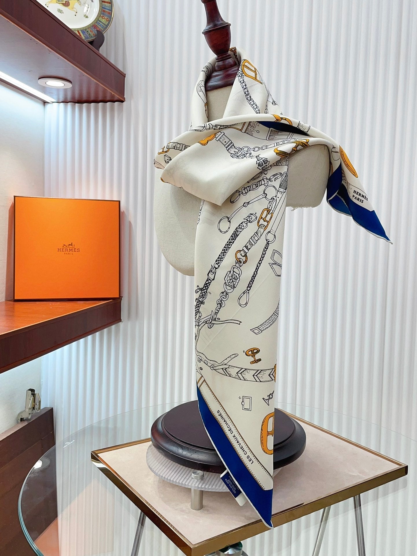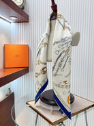 Chevaux Dechaines Shawl 90 CM In White Blue Colorful Silk Twill 201033